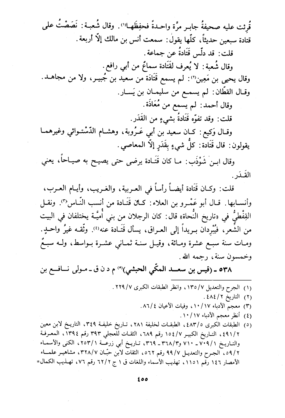 قُلْتُ: وكان قَتَادةُ أيضًا رأسًا فِي العربية، والغريب، وأيام العرب، وأنسابها. قَالَ أَبُو عَمْرو بْن العلاء: كَانَ قَتَادةُ مِنْ أنسب النَّاسَ [3] . ونقل القِفْطيُّ فِي «تاريخ النُّحاة» قَالَ: كَانَ الرجلان مِنْ بني أُمَّية يختلفان فِي البيت مِنَ الشِّعر، فيُبْرِدان بريدًا إلى العراق، يسأل قَتَادةُ عَنْه [4] . وثَّقه غير واحد.