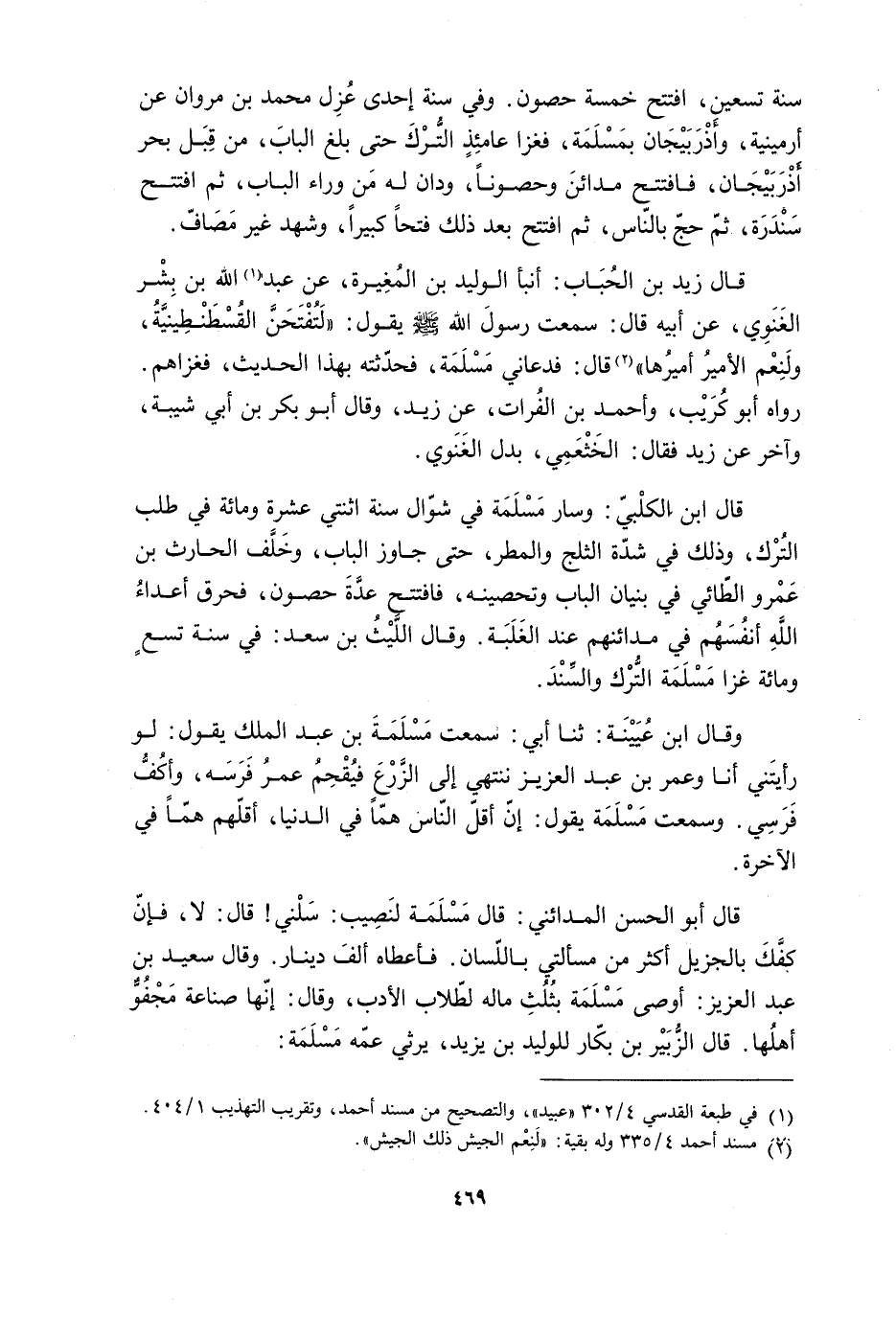 قَالَ زَيْدُ بْنُ الْحُبَابِ: أَنْبَأَ الْوَلِيدُ بْنُ الْمُغِيرَةِ، عَنْ عَبْدِ [1] اللَّهِ بْنِ بِشْرٍ الْغَنَوِيِّ، عَنْ أَبِيهِ قَالَ: سَمِعْتُ رَسُولَ اللَّهِ صَلَّى اللَّهُ عَليْه وَسَلَّمَ يَقُولُ: «لَتُفْتَحَنَّ القُسْطَنْطِينيَّةُ، ولَنِعْم الأميرُ أميرُها» [2] قَالَ: فَدَعَانِي مُسْلِمَةُ، فَحَدَّثْتُهُ بِهَذَا الْحَدِيثِ، فَغَزَاهُمْ.