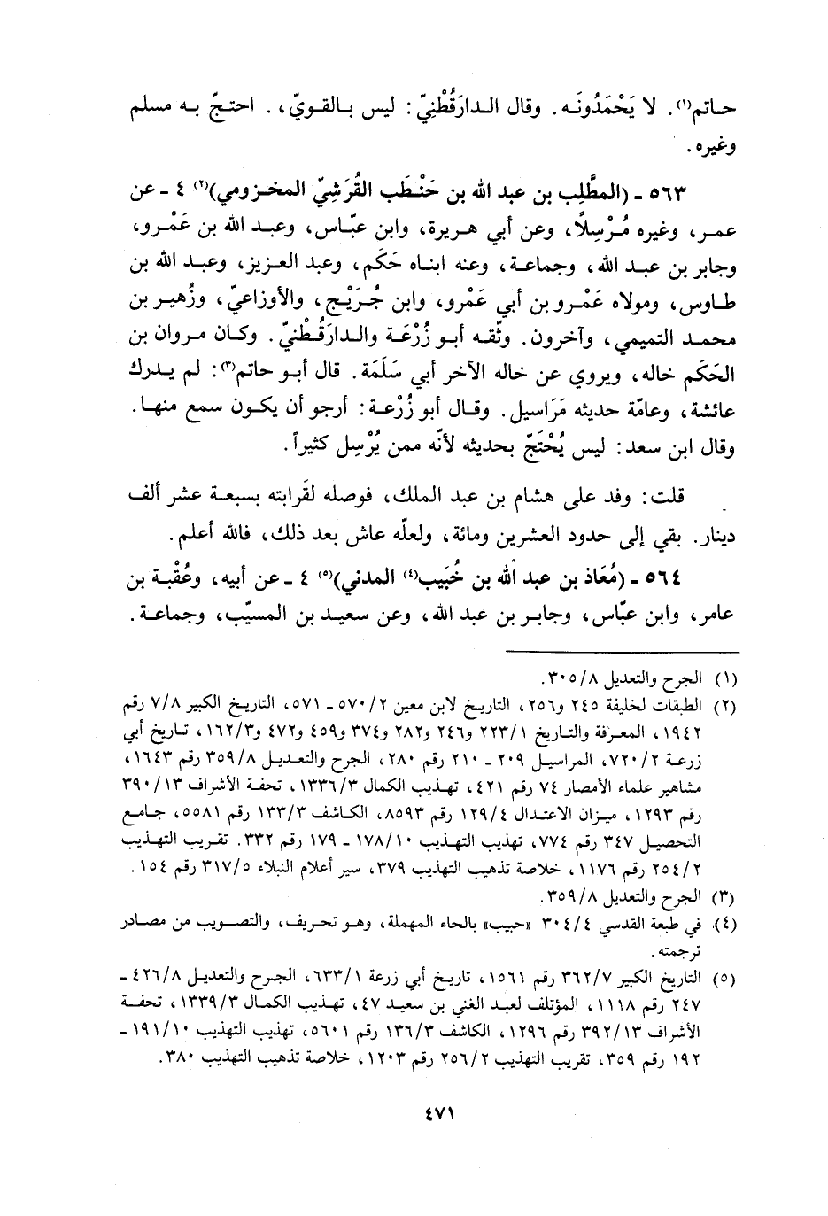 563- (المطَّلِب بْن عَبْد اللَّه بْن حَنْطَب القرشيّ المخزومي) [2] 4- عن عمر، وغيره مرسلا، وعن أبي هُرَيْرَةَ، وابن عَبَّاس، وعَبْد اللَّه بْن عَمْرو، وجابر بن عبد الله، وجماعة، وعنه ابناه حكم، وعبد العزيز، وعبد الله بن طاوس، ومولاه عمرو بن أبي عمرو، وابن جريج، والأوزاعي، وزهير بن محمد التميمي، وآخرون. وثقه أبو زرعة والدارقطني. وكان مروان بن الحكم خاله، ويروى عَنْ خاله الآخر أَبِي سَلَمَةَ. قَالَ أَبُو حاتم [3] : لم يدرك عَائِشَةَ، وعامّة حديثه مَرَاسيل. وقَالَ أَبُو زُرْعة: أرجو أن يكون سَمِعَ منها.
