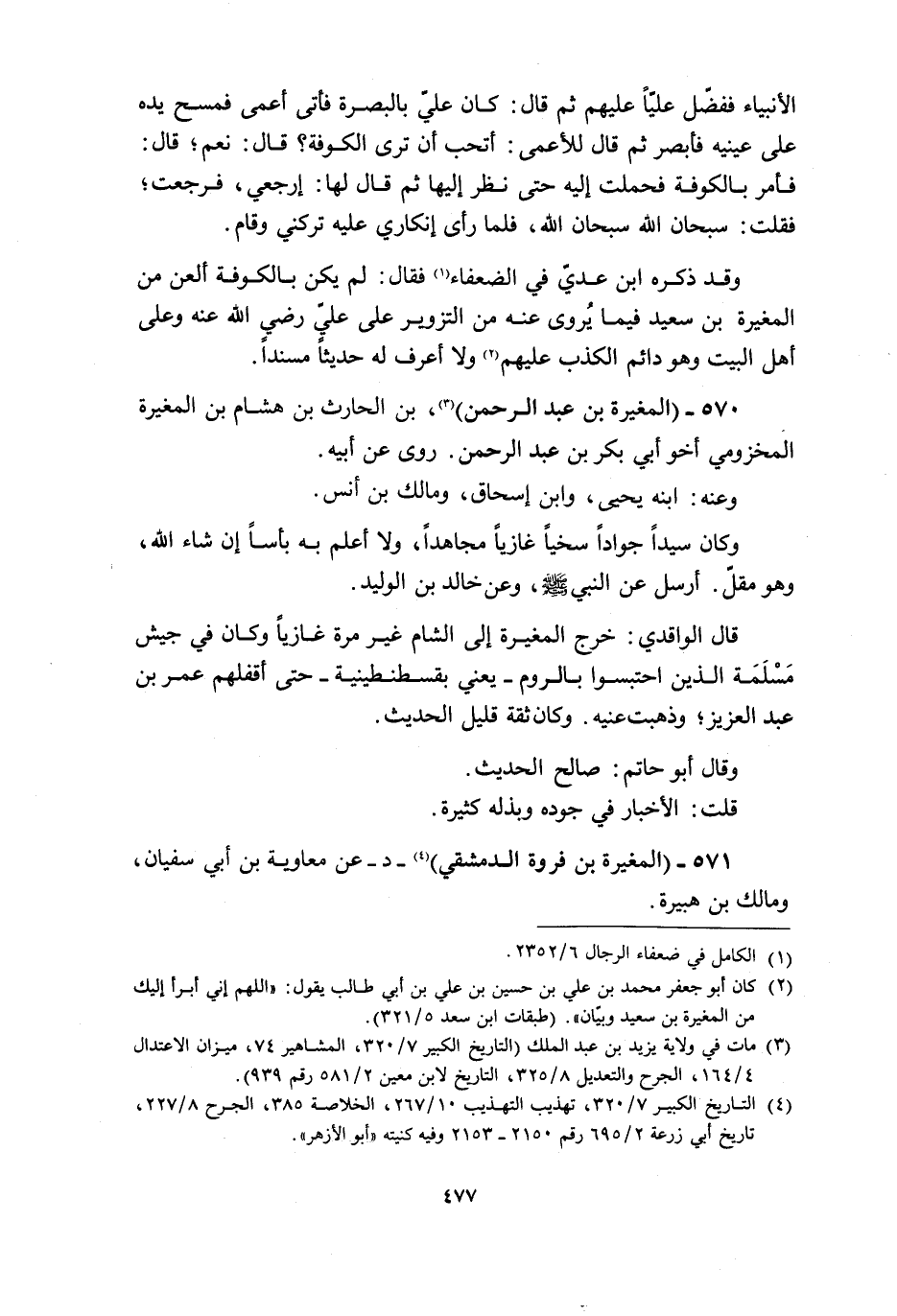 فأمر بالكوفة فحملت إِلَيْهِ حتى نظر إليها ثم قَالَ لها: ارجعي، فرجعت، فقلت: سبحان اللَّه سبحان اللَّه، فلما رأى إنكاري عَلَيْهِ تركني وقام. وقد ذكره ابن عَدِيّ فِي الضعفاء [1] فقال: لم يكن بالكوفة ألعن مِنَ المغيرة بْن سَعِيد فيما يُرْوَى عَنْه مِنَ التزوير عَلَى عليّ رَضِيَ اللَّه عَنْه وعلى أهل البيت وهو دائم الكذب عليهم [2] ولا أعرف لَهُ حديثًا مسندًا.