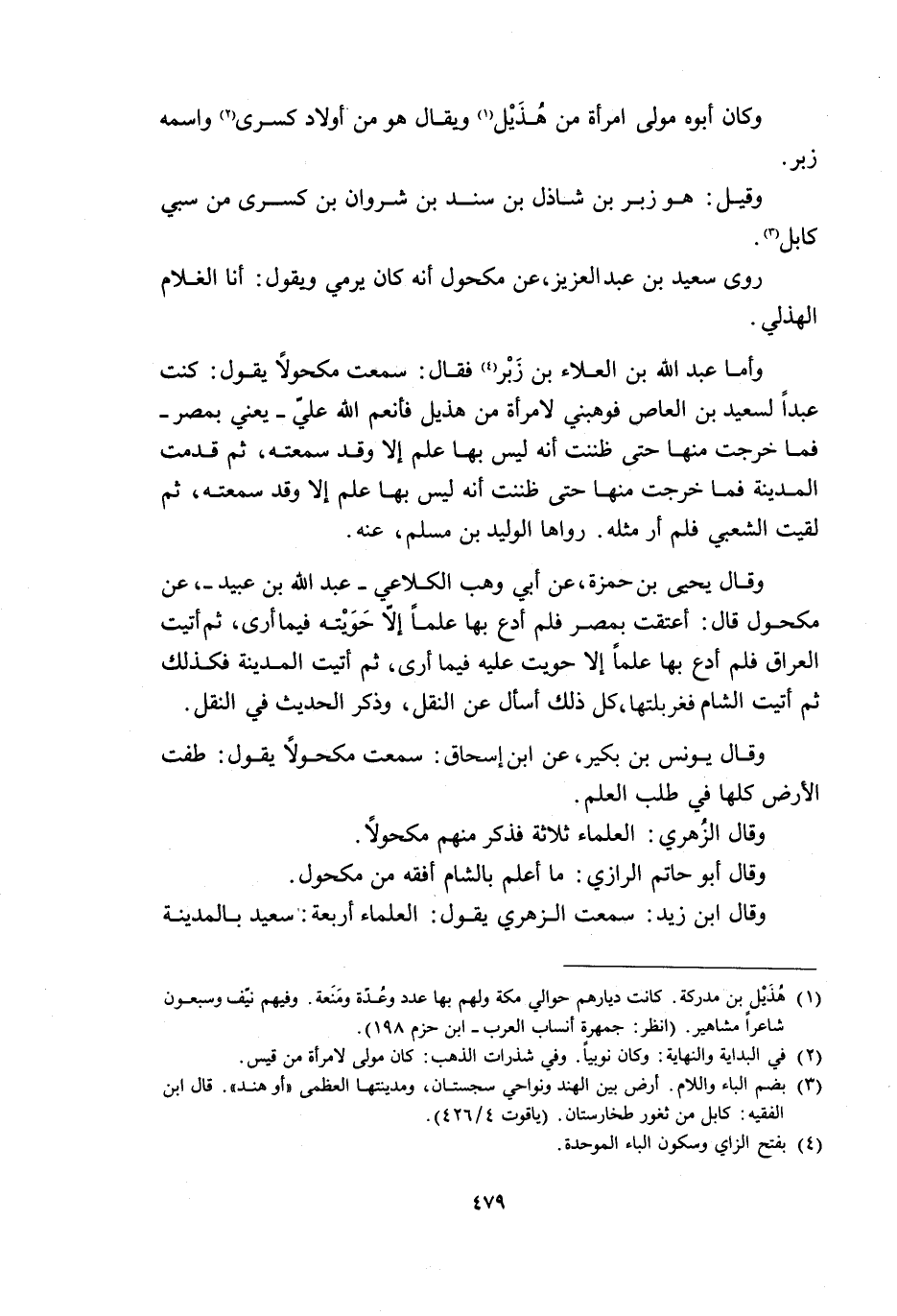 وأما عبد الله بن العلاء بْن زَبْر [4] فَقَالَ: سَمِعْتُ مكحولا يَقُولُ: كنت عبدًا لسعيد بْن العاص فوهبني لامرأة مِنْ هذيل فأنعم اللَّه عليّ- يعني بمصر- فما خرجت منها حتى ظننت أَنَّهُ لَيْسَ بها علم إلا وقد سمعته، ثم قدمت المدينة فما خرجت منها حتى ظننت أَنَّهُ لَيْسَ بها علم إلا وقد سَمِعْتُهُ، ثم لقيت الشَّعْبي فلم أر مثْلَه. رواها الوليد بْن مُسْلِم، عَنْه.