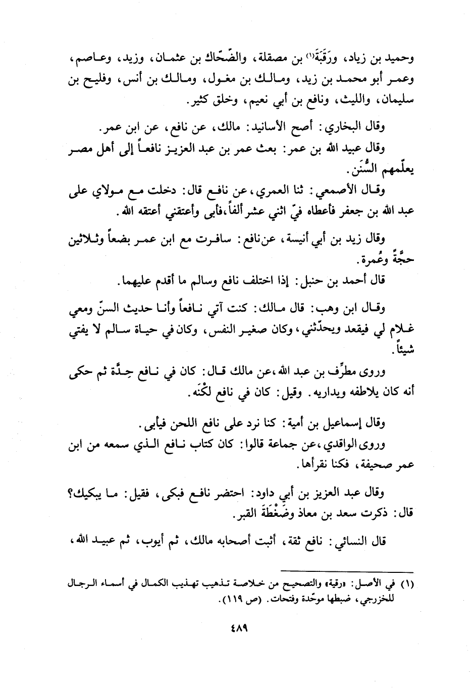 قَالَ النّسائي: نافع ثقة، أثبت أصحابه مالك، ثم أيوب، ثم عبيد الله،
