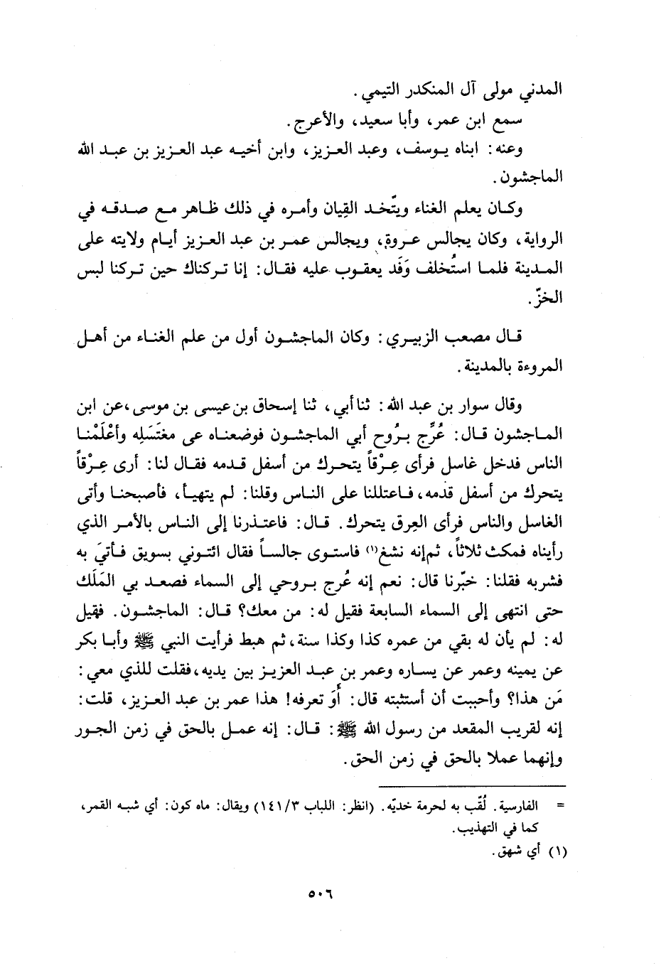 وقَالَ سوار بْن عَبْد اللَّه: ثَنَا أَبِي، ثنا إسحاق بْن عيسى بْن مُوسَى، عَنِ ابن الماجشون قَالَ: عُرِّج برُوح أَبِي الماجشون فوضعناه عَلَى مغتَسِلِه وأعلَمْنا النَّاسَ فدخل غاسل فرأى عِرْقًا يتحرك من أسفل قدمه فَقَالَ لنا: أرى عِرْقًا يتحرك مِنْ أسفل قدمه، فاعتللنا عَلَى النَّاسَ وقلنا: لم يتهيأ، فأصبحنا وأتى الغاسل والناس فرأى العِرق يتحرك. قَالَ: فاعتذرنا إلى النَّاسَ بالأمر الَّذِي رأيناه فمكث ثلاثًا، ثم إنّه نشغ [1] فاستوى جالسًا فَقَالَ ائتوني بسويق فأتيَ بِهِ فشربه فقلنا: خبّرنا قَالَ: نعم إنّه عُرج بروحي إلى السماء فصعد بي المَلَك حتى انتهى إلى السماء السابعة فقيل لَهُ: مِنْ معك؟ قَالَ: الماجشون. فقيل لَهُ: لم يأن لَهُ بقي مِنْ عمره كذا وكذا سنة، ثم هبط فرأيت النَّبيّ صَلَّى اللَّهُ عَليْه وَسَلَّمَ وَأَبَا بَكْر عَنْ يمينه وعُمَر عَنْ يساره وعُمَر بْن عَبْد العزيز بين يديه، فقلت للذي معي: