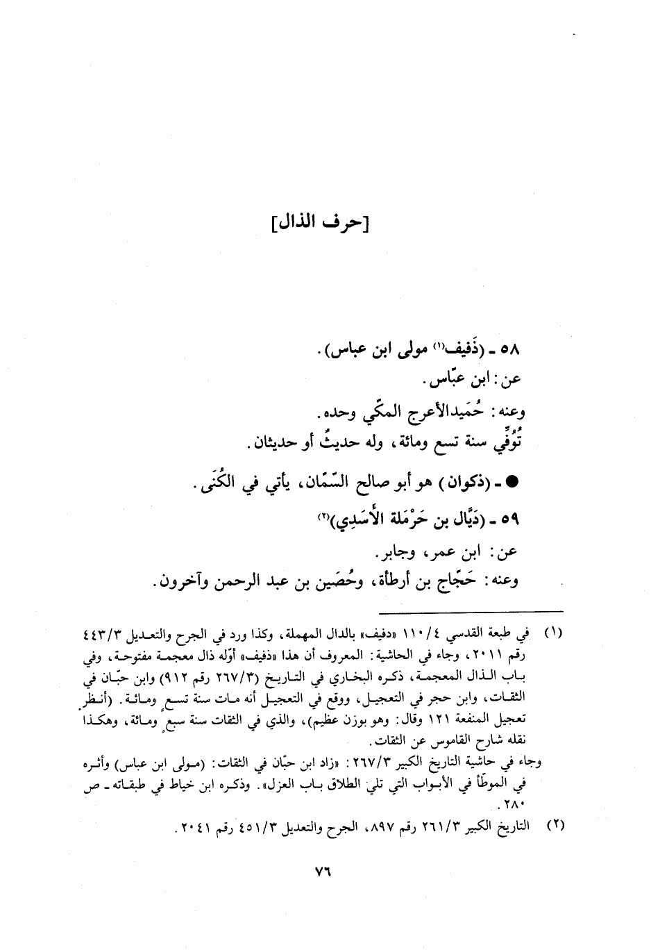 [1] في طبعة القدسي 4/ 110 «دفيف» بالدال المهملة، وكذا ورد في الجرح والتعديل 3/ 443 رقم 2011، وجاء في الحاشية: المعروف أن هذا «ذفيف» أوّله ذال معجمة مفتوحة، وفي باب الذال المعجمة، ذكره البخاري في التاريخ (3/ 267 رقم 912) وابن حبّان في الثقات، وابن حجر في التعجيل، ووقع في التعجيل أنه مات سنة تسع ومائة. (انظر تعجيل المنفعة 121 وقال: وهو بوزن عظيم) ، والّذي في الثقات سنة سبع ومائة، وهكذا نقله شارح القاموس عن الثقات.