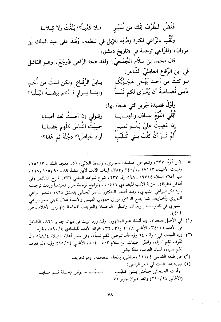 [ () ] لابن دريد 337، وشعر في حماسة الشجري، وسمط اللآلئ 50، معجم البلدان 3/ 251، وفيات الأعيان 3/ 171 و 5/ 240 و 383، لباب الأدب لابن منقذ 89- 90 و 105 و 268، سير أعلام النبلاء 4/ 597- 598 رقم 237، شرح شواهد المغني 336، شرح النقائض (في أماكن متفرقة) ، خزانة الأدب للبغدادي 1/ 504، وتراجع ترجمة جرير فحيثما وردت ترجمته يرد ذكر الراعي النميري، وقد أصدر الدكتور ناصر الحاني بدمشق 1964 «شعر الراعي النميري وأخباره» ، كما جمع الدكتور نوري حمودي القيسي والأستاذ هلال ناجي شعر الراعي النميري في كتاب صدر ببغداد، وانظر: البرصان والعرجان للجاحظ (فهرس الأعلام- ص 404) .