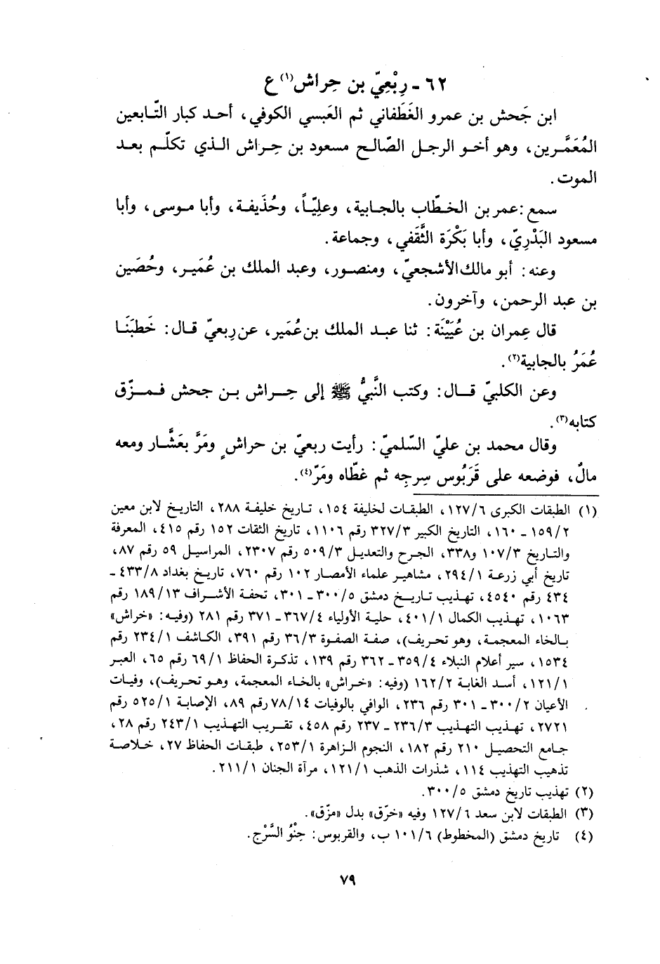 62- ربعيّ بن حراش [1] ع ابْنِ جَحْشِ بْنِ عَمْرٍو الْغَطَفَانِيُّ ثُمَّ الْعَبْسِيُّ الكوفي، أَحَدُ كِبَارِ التَّابِعِينَ الْمُعَمَّرِينَ، وَهُوَ أَخُو الرَّجُلِ الصَّالِحِ مَسْعُودِ بْنُ حِرَاشٍ الَّذِي تَكَلَّمَ بَعْدَ الْمَوْتِ.