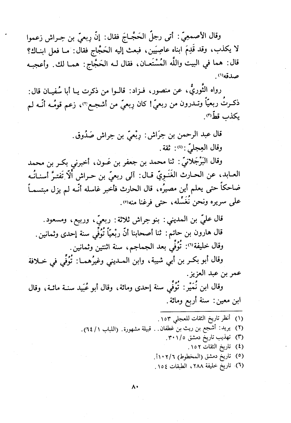 قَالَ عَبْدُ الرَّحْمَنِ بْنُ حِرَاشٍ: رِبْعِيُّ بْنُ حِرَاشٍ صَدُوقٌ.