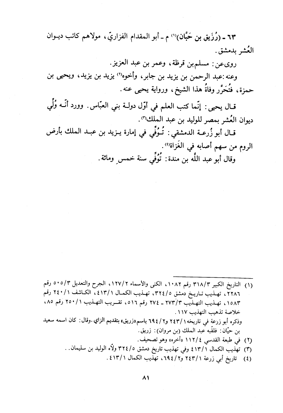63- (رزيق بن حبّان) [1] م- أبو المقدام الفزاريّ، مَوْلاهُمْ كَاتِبُ دِيوَانِ الْعُشْرِ بِدِمَشْقَ.