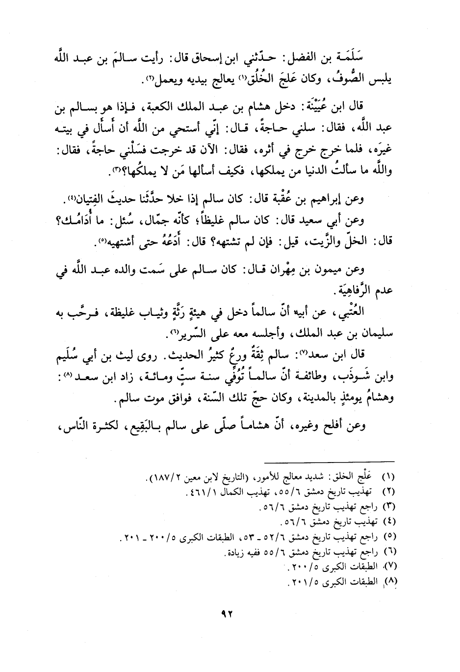 سَلَمَةُ بْنُ الْفَضْلِ: حَدَّثَنِي ابْنُ إِسْحَاقَ قَالَ: رَأَيْتُ سَالِمَ بْنَ عَبْدُ اللَّهِ يَلْبِسُ الصُّوفَ، وَكَانَ عَلِجَ الْخَلْقُ [1] يُعَالِجُ بِيَدَيْهِ وَيَعْمَلُ [2] .
