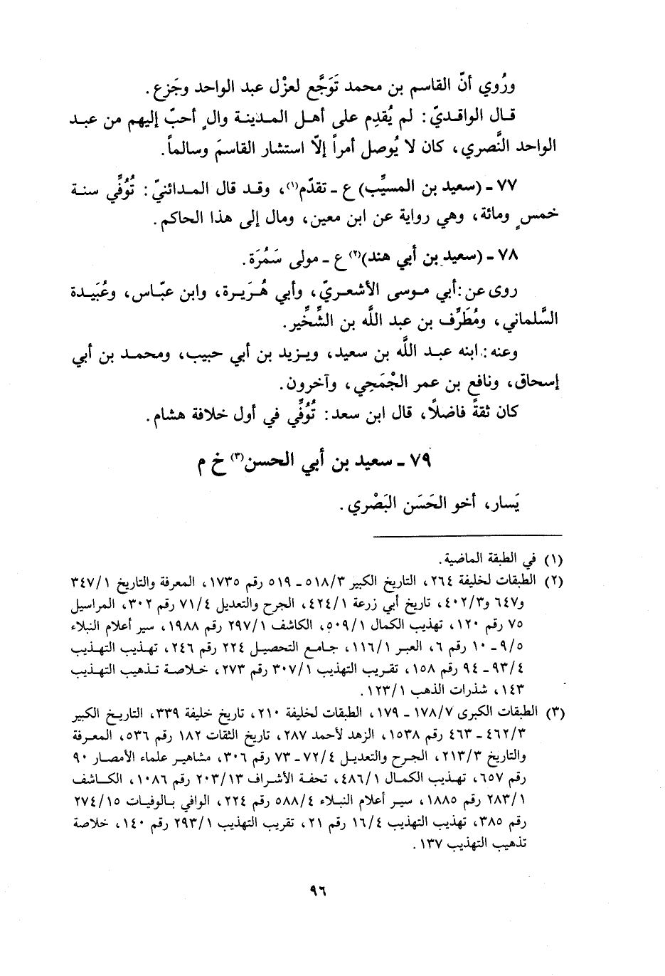 77- (سَعِيدُ بْنُ الْمُسَيِّبِ) ع- تَقَدَّمَ [1] ، وَقَدْ قَالَ الْمَدَائِنِيُّ: تُوُفِّيَ سَنَةَ خَمْسٍ وَمِائَةٍ، وَهِيَ رِوَايَةٌ عَنِ ابْنِ مَعِينٍ، وَمَالَ إِلَى هَذَا الْحَاكِمِ.
