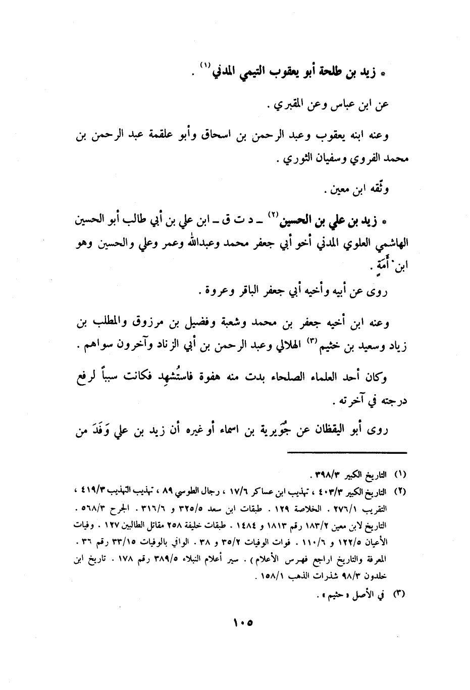 [2] التاريخ الكبير 3/ 403، تهذيب ابن عساكر 6/ 17، رجال الطوسي 89، تهذيب التهذيب 3/ 419، التقريب 1/ 276. الخلاصة 129، طبقات ابن سعد 5/ 325 و 6/ 316. الجرح 3/ 568.