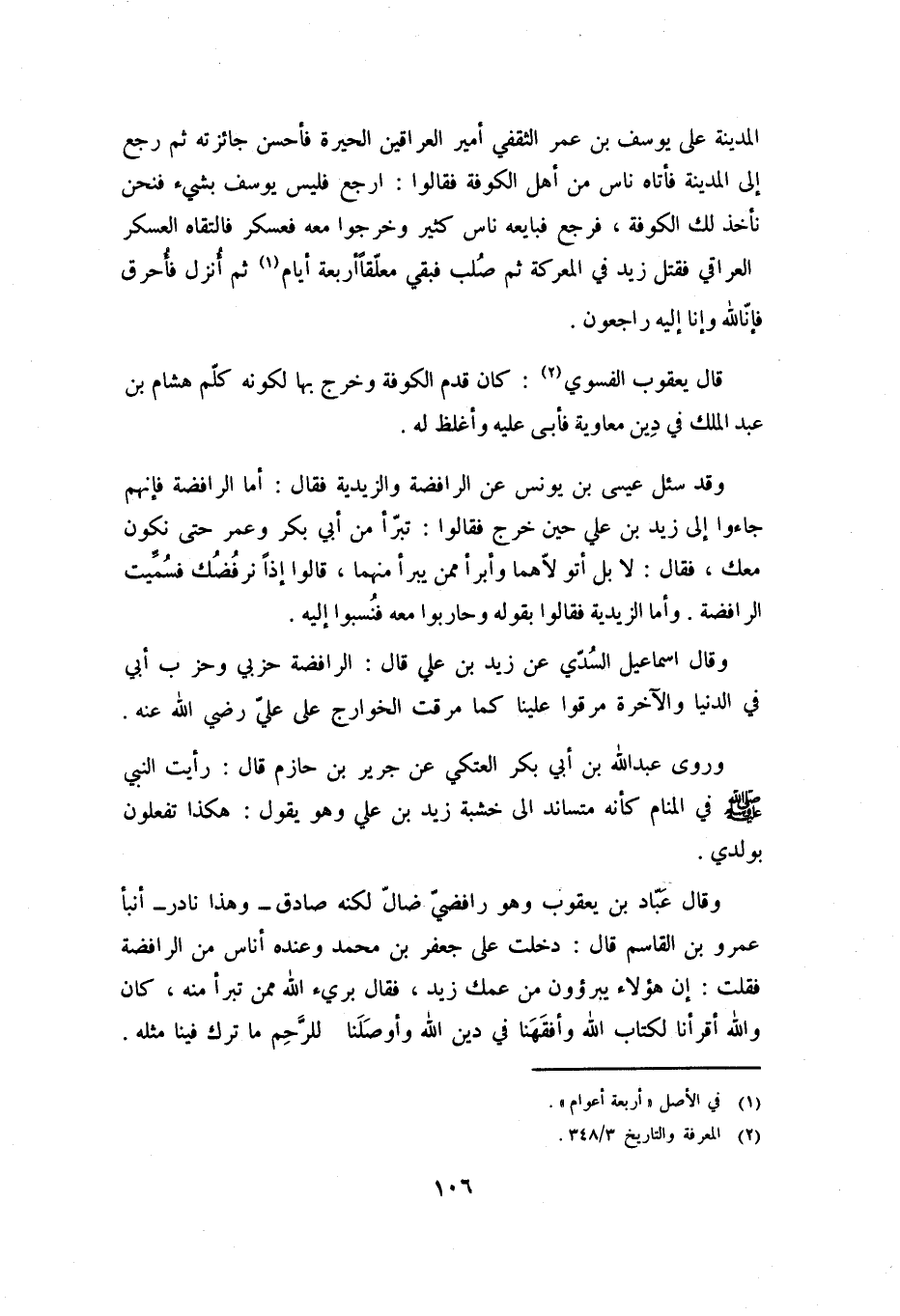 وَقَدْ سُئِلَ عِيسَى بْنُ يُونُسَ عَنِ الرَّافِضَةِ وَالزَّيْدِيَّةِ فَقَالَ: أَمَّا الرَّافِضَةُ فَإِنَّهُمْ جَاءُوا إِلَى زَيْدِ بْنِ عَلِيٍّ حِينَ خَرَجَ فَقَالُوا: تَبَرَّأْ مِنْ أَبِي بَكْرٍ وَعُمَرَ حَتَّى نَكُونَ مَعَكَ، فَقَالَ: لا بَلْ أَتَوَلاهُمَا وَأَبْرَأُ مِمَّنْ يَبْرَأُ مِنْهُمَا، قَالُوا إِذًا نَرْفُضُكَ فَسُمِّيَتِ الرَّافَضَةُ. وأما الزيدية فقالوا بِقَوْلِهِ وَحَارَبُوا مَعَهُ فنُسِبُوا إِلَيْهِ.