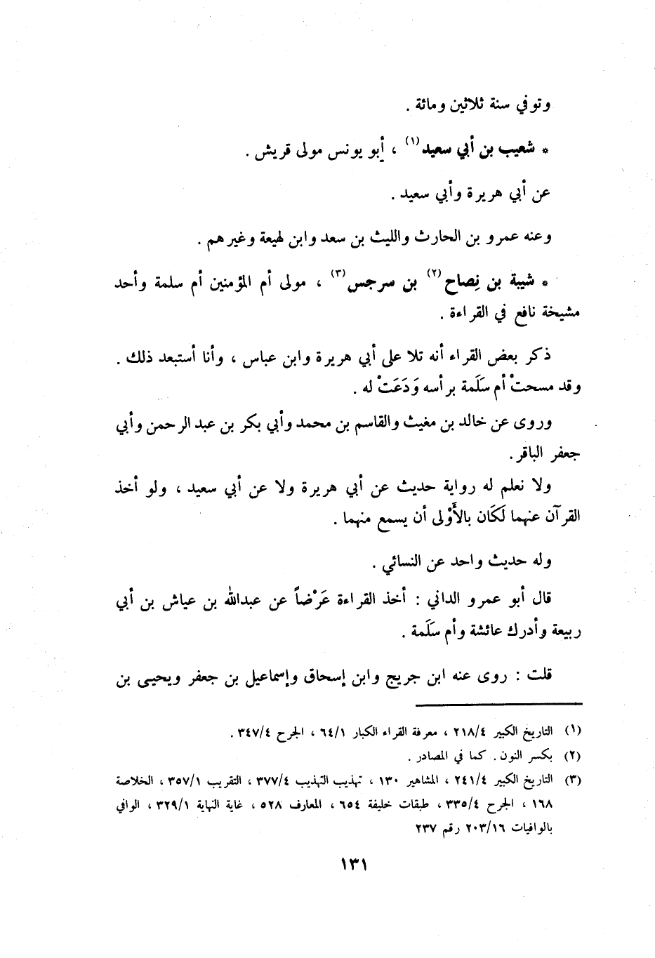 [3] التاريخ الكبير 4/ 241، المشاهير 130، تهذيب التهذيب 4/ 377، التقريب 1/ 357، الخلاصة 168، الجرح 4/ 335، طبقات خليفة 654، المعارف 528، غاية النهاية 1/ 329، الوافي بالوافيات 16/ 203 رقم 237
