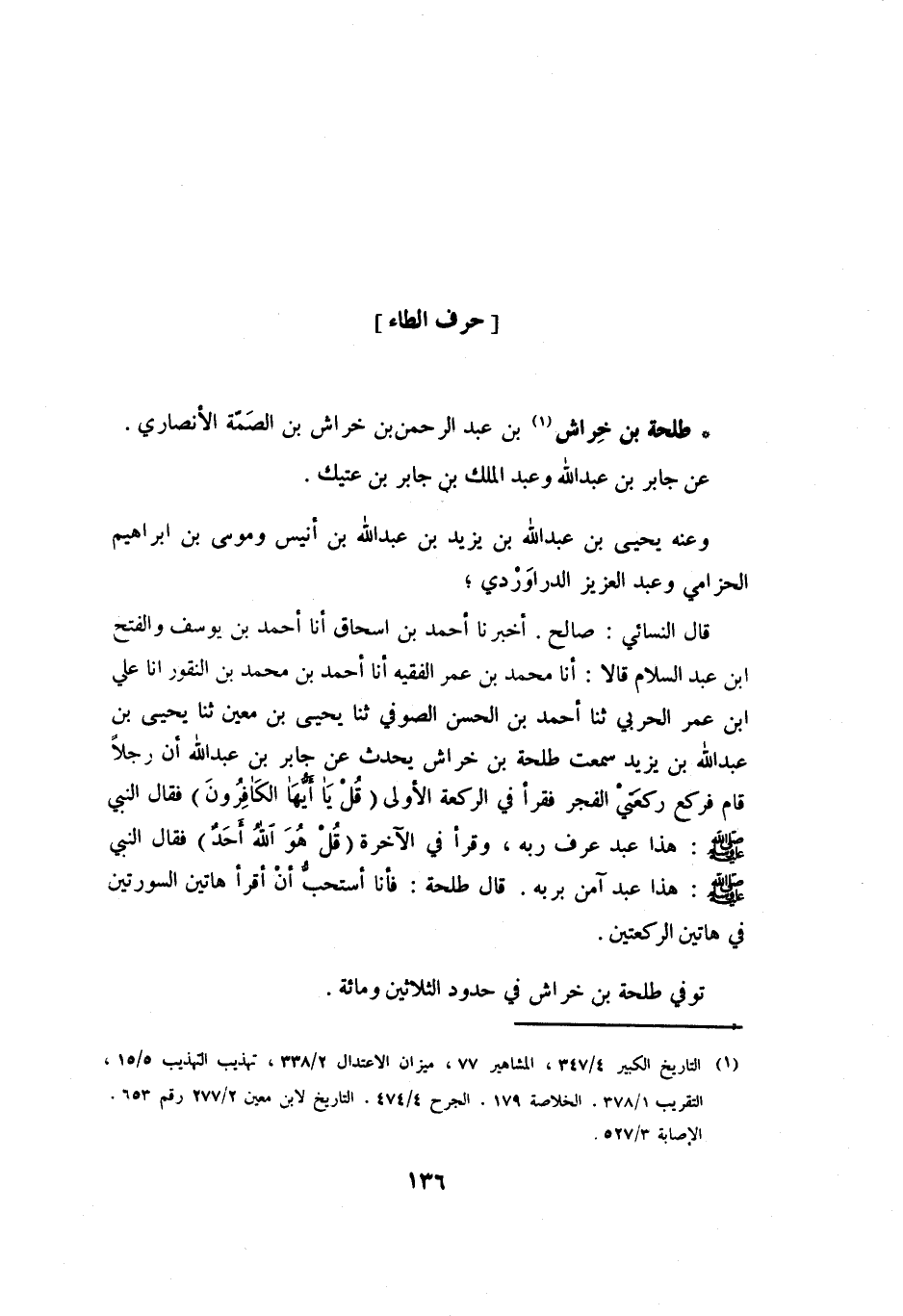 وَعَنْهُ يَحْيَى بْنُ عَبْدِ اللَّهِ بْنِ يَزِيدَ بْنِ عَبْدِ اللَّهِ بْنِ أُنَيْسٍ وَمُوسَى بْنُ إِبْرَاهِيمَ الْحِزَامِيُّ وَعَبْدُ الْعَزِيزِ الدراوَرْديّ، قَالَ النَّسَائِيُّ: صَالِحٌ. أَخْبَرَنَا أَحْمَدُ بْنُ إِسْحَاقَ أَنَا أَحْمَدُ بْنُ يوسف والفتح ابن عَبْدِ السَّلامِ قَالا: أَنَا مُحَمَّدُ بْنُ عُمَرَ الْفَقِيهُ أَنَا أَحْمَدُ بْنُ مُحَمَّدِ بْنِ النَّقُّورِ أَنَا عَلِيُّ ابن عُمَرَ الْحَرْبِيُّ ثَنَا أَحْمَدُ بْنُ الْحَسَنِ الصُّوفِيُّ ثَنَا يَحْيَى بْنُ مَعِينٍ ثنا يَحْيَى بْنُ عَبْدِ اللَّهِ بْنِ يَزِيدَ سَمِعْتُ طَلْحَةَ بْنَ خِرَاشٍ يُحَدِّثُ عَنْ جَابِرِ بْنِ عَبْدِ اللَّهِ أَنَّ رَجُلا قَامَ فَرَكَعَ رَكْعَتَيِ الْفَجْرِ فَقَرَأَ في الركعة الأولى (قُلْ يا أَيُّهَا الْكافِرُونَ) 109: 1 فَقَالَ النَّبِيُّ صَلَّى اللَّهُ عَلَيْهِ وَسَلَّمَ: هَذَا عَبْدٌ عَرَفَ رَبَّهُ، وَقَرَأَ فِي الآخِرَةِ (قُلْ هُوَ اللَّهُ أَحَدٌ) 112: 1 فَقَالَ النَّبِيُّ صَلَّى اللَّهُ عَلَيْهِ وَسَلَّمَ: هَذَا عَبْدٌ آمَنَ بِرَبِّهِ. قَالَ طَلْحَةُ: فَأَنَا أَسْتَحِبُّ أَنْ أَقْرَأَ هَاتَيْن السُّورَتَيْنِ فِي هَاتَيْنِ الرَّكْعَتَيْنِ.