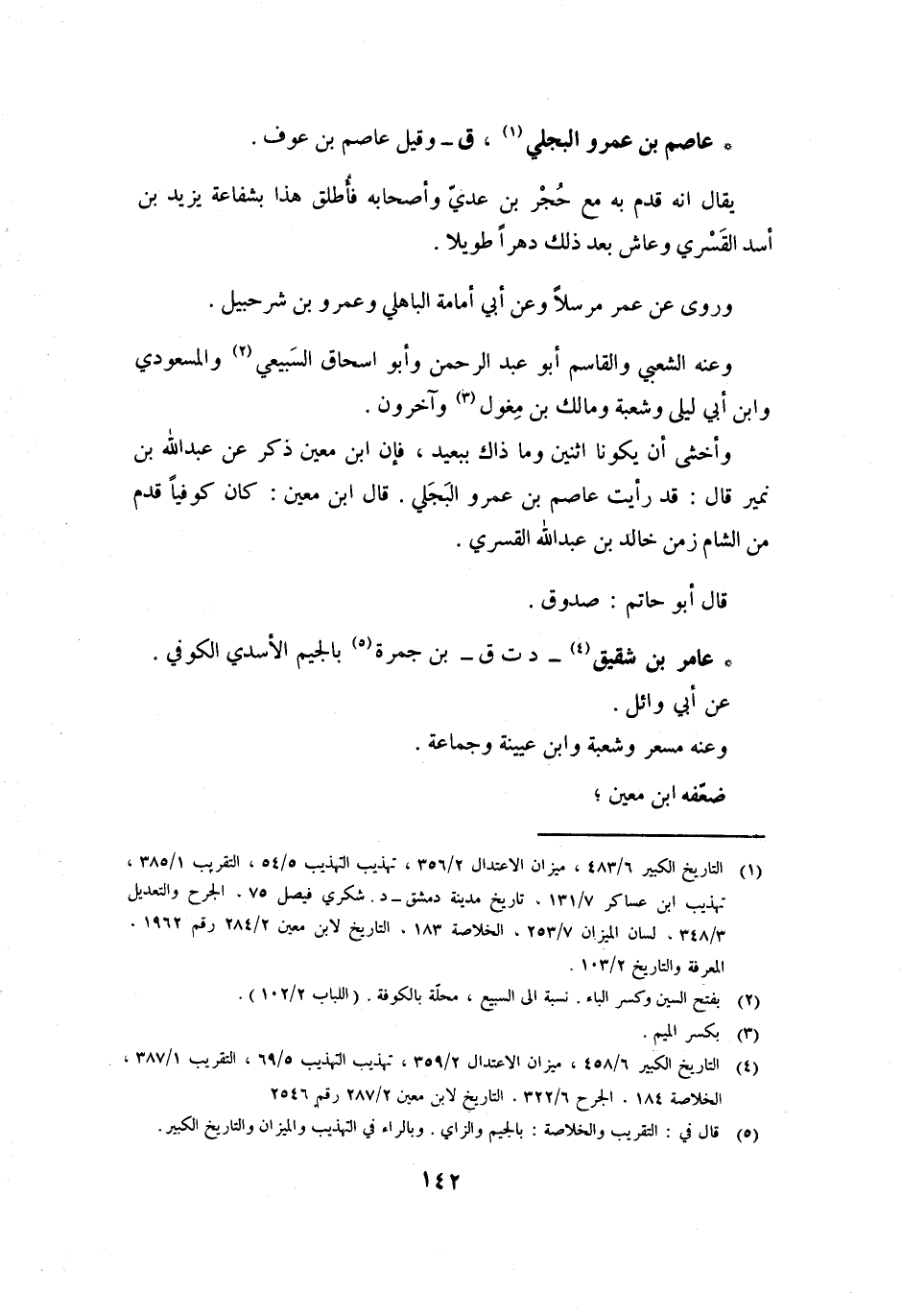 وأخشى أن يكونا اثنين وما ذاك بِبَعِيدٍ، فَإِنَّ ابْنَ مَعِينٍ ذَكَرَ عَنْ عَبْدِ اللَّهِ بْنِ نُمَيْرٍ قَالَ: قَدْ رَأَيْتُ عَاصِمَ بْنَ عَمْرٍو الْبَجَلِيَّ. قَالَ ابْنُ مَعِينٍ: كَانَ كُوفِيًّا قَدِمَ مِنَ الشَّامِ زَمَنَ خَالِدِ بْنِ عَبْدِ اللَّهِ الْقَسْرِيِّ.