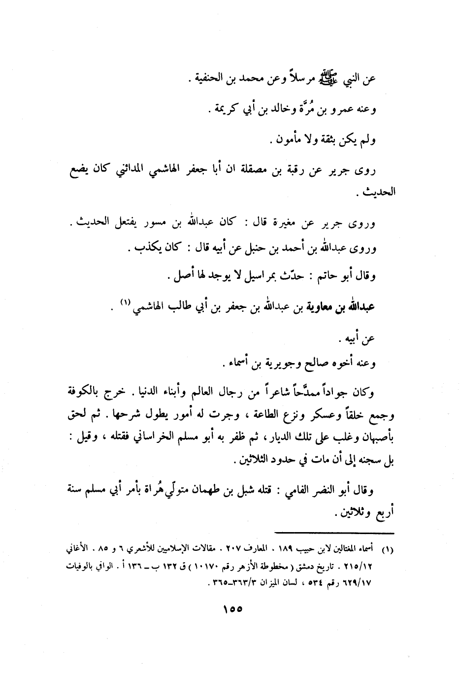 [1] أسماء المغتالين لابن حبيب 189. المعارف 207. مقالات الإسلاميين للأشعري 6 و 85. الأغاني 12/ 215. تاريخ دمشق (مخطوطة الأزهر رقم 10170) ق 132 ب- 136 أ. الوافي بالوفيات 17/ 629 رقم 534، لسان الميزان 3/ 363- 365.