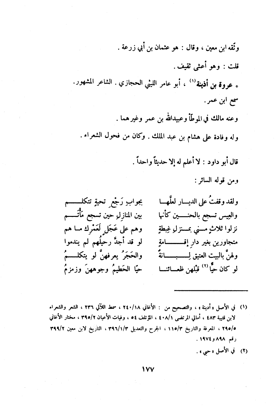 [1] في الأصل «أدينة» ، والتصحيح من: الأغاني 18/ 240، سمط اللآلي 236، الشعر والشعراء لابن قتيبة 483، أمالي المرتضى 1/ 408، المؤتلف 54، وفيات الأعيان 2/ 395، مختار الأغاني 5/ 295، المعرفة والتاريخ 3/ 115، الجرح والتعديل 3/ 1/ 396، التاريخ لابن معين 2/ 399 رقم 898 و 1974.