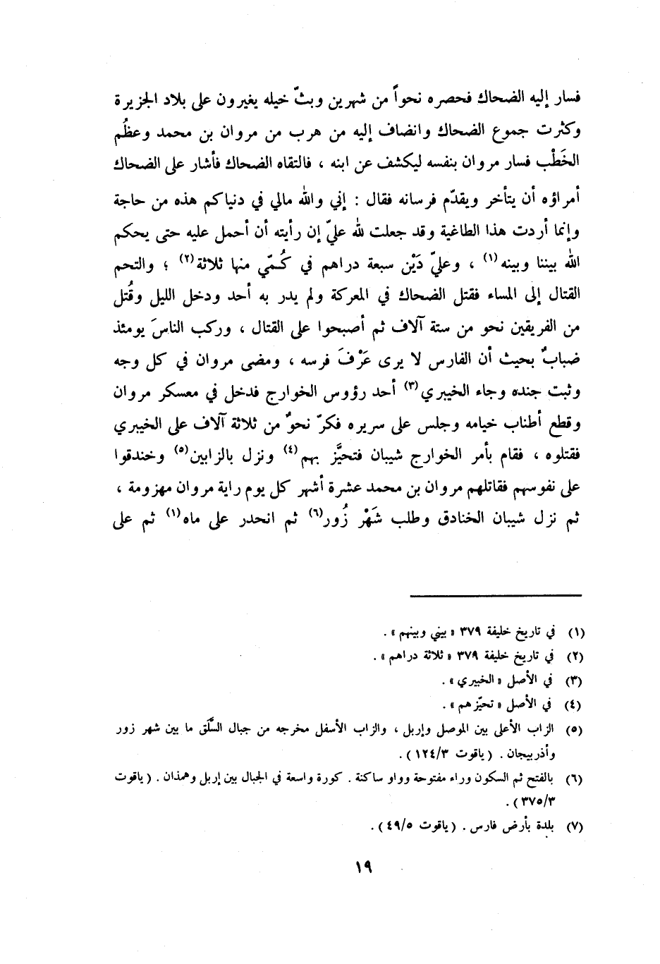 فسار إليه الضحاك فحصره نَحْوًا مِنْ شَهْرَيْنِ وَبَثَّ خَيْلَهُ يُغِيرُونَ عَلَى بِلادِ الْجِزِيرَةِ وَكَثُرَتْ جُمُوعُ الضَّحَّاكِ وَانْضَافَ إِلَيْهِ مَنْ هَرِبَ مِنْ مَرْوَانَ بْنِ مُحَمَّدٍ وَعَظُمَ الْخَطْبُ فَسَارَ مَرْوَانُ بِنَفْسِهِ لِيَكْشِفَ عَنِ ابْنِهِ، فَالْتَقَاهُ الضَّحَّاكُ فَأَشَارَ عَلَى الضَّحَّاكِ أُمَرَاؤُهُ أَنْ يتأخر ويقدّم فرسانه فقال: إني والله ما لي فِي دُنْيَاكُمْ هَذِهِ مِنْ حَاجَةٍ وَإِنَّمَا أَرَدْتُ هَذَا الطَّاغِيَةَ وَقَدْ جَعَلْتُ للَّه عَلَيَّ إِنْ رَأَيْتُهُ أَنْ أَحْمِلَ عَلَيْهِ حَتَّى يَحْكُمَ اللَّهُ بَيْنَنَا وَبَيْنَهُ [1] ، وَعَلَيَّ دَيْنٌ سَبْعَةُ دَرَاهِمَ فِي كُمِّي مِنْهَا ثَلاثَةٌ [2] ، وَالْتَحَمَ الْقِتَالُ إِلَى الْمَسَاءِ فَقُتِلَ الضَّحَّاكُ فِي الْمَعْرَكَةِ وَلَمْ يَدْرِ بِهِ أَحَدٌ وَدَخَلَ اللَّيْلُ وَقُتِلَ مِنَ الْفَرِيقَيْنِ نَحْوٌ مِنْ سِتَّةِ آلافٍ ثُمَّ أَصْبَحُوا عَلَى الْقِتَالِ، وَرَكَبَ النَّاس يَوْمَئِذٍ ضَبَابٌ بِحَيْثُ أَنَّ الْفَارِسَ لا يَرَى عَرْفَ فَرَسِهِ، وَمَضَى مَرْوَانُ فِي كُلِّ وَجْهٍ وَثَبَتَ جُنْدُهُ وَجَاءَ الْخَيْبَرِيُّ [3] أَحَدُ رُءُوسِ الْخَوَارِجِ فَدَخَلَ فِي مُعَسْكَرِ مَرْوَانَ وَقَطَعَ أَطْنَابَ خِيَامِهِ وَجَلَسَ عَلَى سَرِيرِهِ فَكَرَّ نَحْوٌ مِنْ ثَلاثَةِ آلافٍ عَلَى الْخَيْبَرِيِّ فَقَتَلُوهُ، فَقَامَ بِأَمْرِ الْخَوَارِجِ شَيْبَانُ فَتَحَيَّزَ بِهِمْ [4] وَنَزَلَ بِالزَّابَيْنِ [5] وَخَنْدَقُوا عَلَى نُفُوسِهِمْ فَقَاتَلَهُمْ مَرْوَانُ بْنُ مُحَمَّدٍ عَشْرَةَ أَشْهُرٍ كُلُّ يَوْمٍ رَايَةُ مَرْوَانَ مَهْزُومَةٌ، ثم نزل شيبان الخنادق وطلب شهرزور [6] ثم انحدر على ماه [7] ثم على