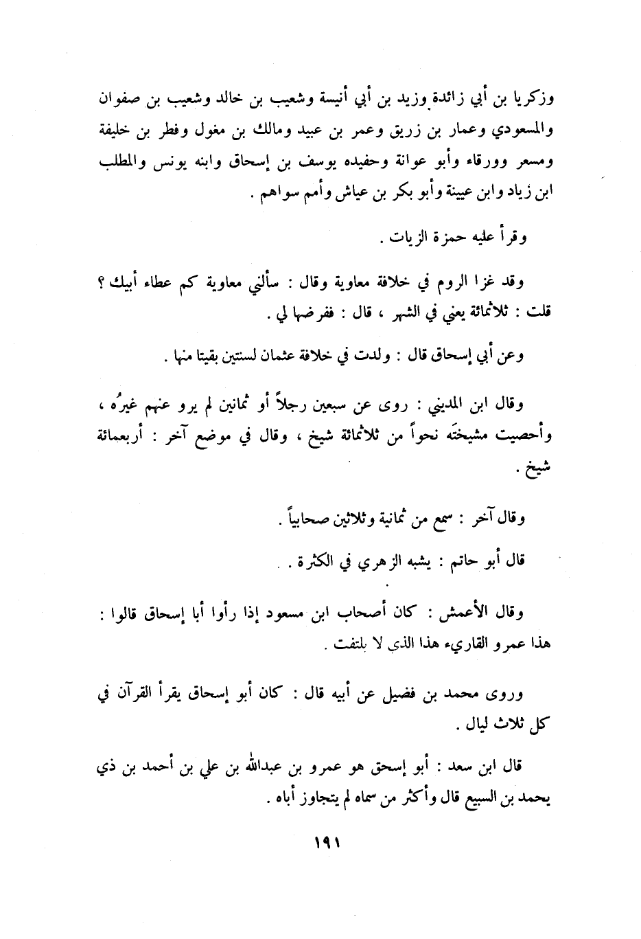 وَرَوَى مُحَمَّدُ بْنُ فُضَيْلٍ عَنْ أَبِيهِ قَالَ: كَانَ أَبُو إِسْحَاقَ يَقْرَأُ الْقُرْآنَ فِي كُلِّ ثَلاثِ لَيَالٍ.