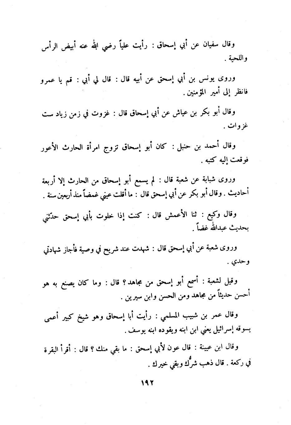 وَرَوَى شَبَابَةُ عَنْ شُعْبَةَ قَالَ: لَمْ يَسْمَعْ أَبُو إِسْحَاقَ مِنَ الْحَارِثِ إِلَّا أَرْبَعَةَ أَحَادِيثَ. وَقَالَ أَبُو بَكْرٍ عَنْ أَبِي إِسْحَاقَ قَالَ: مَا أَقَلْتُ عَيْنَيَّ غُمْضًا مُنْذُ أَرْبَعِينَ سَنَةً.