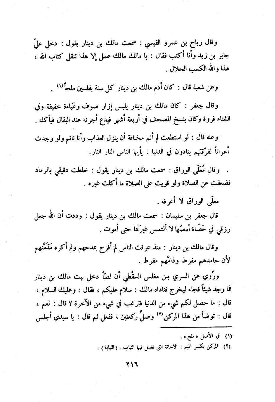 وَقَالَ جَعْفَرٌ: كَانَ مَالِكُ بْنُ دِينَارٍ يَلْبَسُ إِزَارَ صُوفٍ وَعَبَاءَةً خَفِيفَةً وَفِي الشِّتَاءِ فَرْوَةً وَكَانَ يَنْسَخُ الْمُصْحَفِ فِي أَرْبَعَةِ أَشْهُرٍ فَيَدَعُ أُجْرَتَهُ عِنْدَ الْبَقَّالِ فَيَأْكُلُهُ.