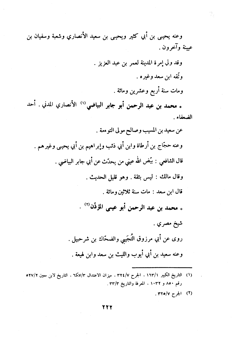 مُحَمَّدُ بْنُ عَبْدِ الرَّحْمَنِ أَبُو جَابِرٍ الْبَيَاضِيُّ [1] الأَنْصَارِيُّ الْمَدَنِيُّ. أَحَدُ الضُّعَفَاءِ.
