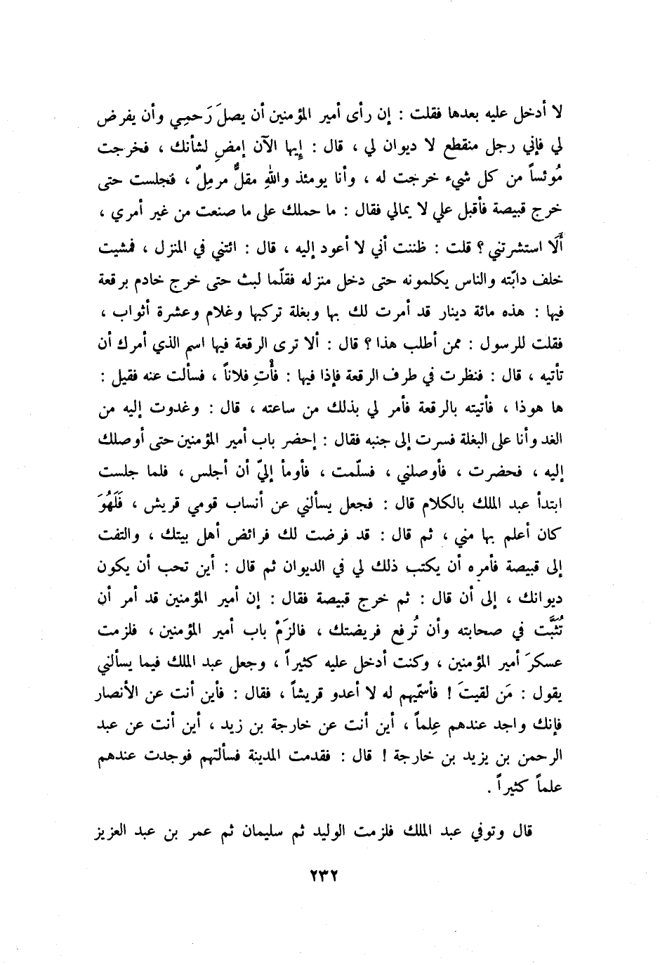 ها هو ذا، فَأَتَيْتُهُ بِالرُّقْعَةِ فَأَمَرَ لِي بِذَلِكَ مِنْ سَاعَتِهِ، قَالَ: وَغَدَوْتُ إِلَيْهِ مِنَ الْغَدِ وَأَنَا عَلَى الْبَغْلَةِ فَسِرْتُ إِلَى جَنْبِهِ فَقَالَ: احْضَرْ بَابَ أَمِيرِ الْمُؤْمِنِينَ حَتَّى أُوَصِّلَكَ إِلَيْهِ، فَحَضَرْتُ، فَأَوْصَلَنِي، فَسَلَّمْتُ، فَأَوْمَأَ إِلَيَّ أَنْ أَجْلِسَ، فَلَمَّا جَلَسْتُ ابْتَدَأَ عَبْدُ الْمَلِكِ بِالْكَلامِ قَالَ: فَجَعَلَ يَسْأَلُنِي عَنْ أَنْسَابِ قَوْمِي قُرَيْشٍ، فَلَهُوَ كَانَ أَعْلَمُ بِهَا مِنِّي، ثُمَّ قَالَ: قَدْ فَرَضْتُ لَكَ فَرَائِضَ أَهْلِ بَيْتِكَ، وَالْتَفَتَ إِلَى قَبِيصَةَ فَأَمَرُه أَنْ يَكْتُبَ ذَلِكَ لِي فِي الدِّيوَانِ ثُمَّ قَالَ: أَيْنَ تُحِبُّ أَنْ يَكُونَ دِيوَانِكَ، إِلَى أَنْ قَالَ: ثُمَّ خَرَجَ قَبيِصَةَ فَقَالَ: إِنَّ أَمِيرَ الْمُؤْمِنِينَ قَدْ أَمَرَ أَنْ تُثَبَّتَ فِي صَحَابَتِهِ وَأَنْ تُرْفَعَ فَرِيضَتُكَ، فَالْزَمْ بَابَ أَمِيرِ الْمُؤْمِنِينَ، فَلَزِمْتُ عَسْكَرَ أَمِيرِ الْمُؤمِنِينَ، وَكُنْتُ أَدْخُلُ عَلَيْهِ كَثِيرًا، وَجَعَلَ عَبْدُ الْمَلِكِ فِيمَا يَسْأَلُنِي يَقُولُ: مَنْ لَقِيتَ! فَأُسَمِّيهُمْ لَهُ لا أَعْدُو قُرَيْشًا، فَقَالَ: فَأَيْنَ أَنْتَ عَنِ الأَنْصَارِ فَإِنَّكَ وَاجِدٌ عِنْدَهُمْ عِلْمًا، أَيْنَ أَنْتَ عَنْ خَارِجَةَ بْنِ زَيْدٍ، أَيْنَ أَنْتَ عَنْ عَبْدِ الرَّحْمَنِ بْنِ يَزِيدَ بْنِ خَارِجَةَ! قَالَ: فَقَدِمْتُ الْمَدِينَةَ فَسَأَلْتُهُمْ فَوَجَدْتُ عِنْدَهُمْ عِلْمًا كَثِيرًا.