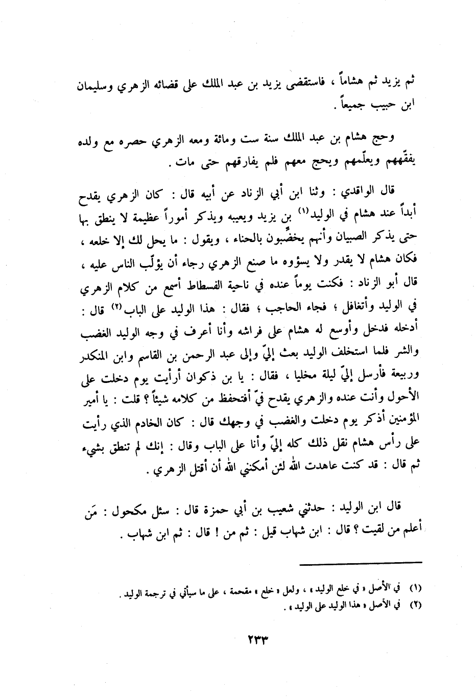 قَالَ الْوَاقِدِيُّ: وثنا ابْنُ أَبِي الزِّنَادِ عَنْ أَبِيهِ قَالَ: كَانَ الزُّهْرِيُّ يَقْدَحُ أَبَدًا عِنْدَ هِشَامٍ فِي الْوَلِيدِ [1] بْنِ يَزِيدَ ويعيبه ويذكر أمورا عظيمة لا ينطق بها حَتَّى يَذْكُرَ الصِّبْيَانِ وَأَنَّهُمْ يُخَضِّبُونَ بِالْحِنَّاءِ، وَيَقُولُ: مَا يَحِلُّ لَكَ إِلا خَلْعُهُ، فَكَانَ هِشَامُ لا يقدر ولا يسؤوه مَا صَنَعَ الزُّهْرِيُّ رَجَاءَ أَنْ يُؤَلِّبَ النَّاسَ عَلَيْهِ، قَالَ أَبُو الزِّنَادِ: فَكُنْتُ يَوْمًا عِنْدَهُ فِي نَاحِيَةِ الْفُسْطَاطِ أَسْمَعُ مِنْ كَلامِ الزُّهْرِيِّ فِي الْوَلِيدِ وَأَتَغَافَلُ، فَجَاءَ الْحَاجِبُ، فَقَالَ: هَذَا الْوَلِيدُ عَلَى الْبَابِ [2] قَالَ: