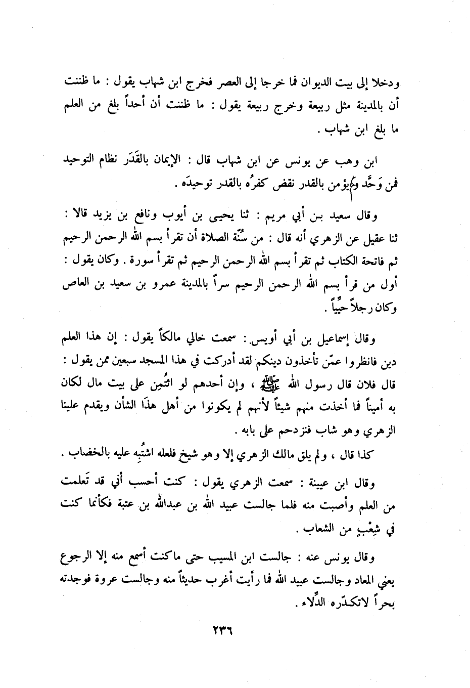 ثنا عُقَيْلٌ عَنِ الزُّهْرِيِّ أَنَّهُ قَالَ: مِنْ سُنَّةِ الصَّلاةِ أَنْ تَقْرَأْ بِسْمِ الله الرحمن الرحيم ثُمَّ فَاتِحَةَ الْكِتَابِ ثُمَّ تَقْرَأُ بِسْمِ اللَّهِ الرَّحْمَنِ الرَّحِيمِ ثُمَّ تَقْرَأُ سُورَةٌ. وَكَانَ يَقُولُ: