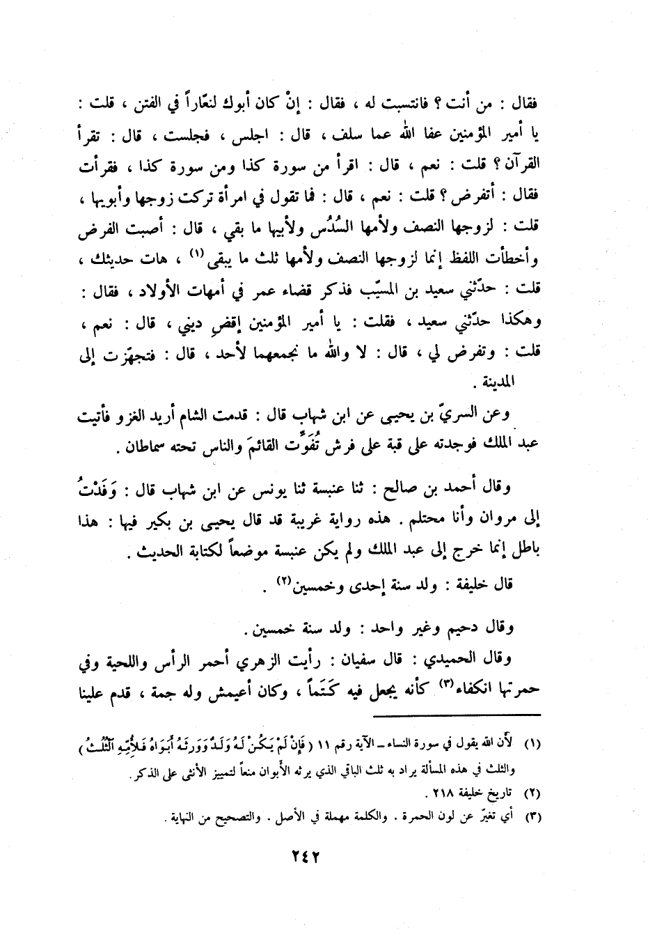 يَا أَمِيرَ الْمُؤْمِنِينَ عَفَا اللَّهُ عَمَّا سَلَفَ، قَالَ: اجْلِسْ، فَجَلَسْتُ، قَالَ: تَقْرَأُ الْقُرْآنَ؟ قُلْتُ: نَعَمْ، قَالَ: اقْرَأْ مِنْ سُورَةِ كَذَا وَمِنْ سُورَةِ كذا، فقرأت فقال: أتفرض؟ قلت: نعم، قَالَ: فَمَا تَقُولُ فِي امْرَأَةٍ تَرَكَتْ زَوْجَهَا وَأَبَوَيْهَا، قُلْتُ: لِزَوْجِهَا النِّصْفُ وَلأُمِّهَا السُّدُسُ وَلِأَبِيهَا مَا بَقِيَ، قَالَ: أَصَبْتَ الْفَرْضَ وَأَخْطَأْتَ اللَّفْظَ إِنَّما لِزَوْجِهَا النِّصْفُ وَلأُمِّهَا ثُلُثُ مَا يَبْقَى [1] ، هَاتِ حَدِيثَكَ، قُلْتُ: حَدَّثَنِي سَعِيدُ بْنُ الْمُسَيِّبِ فَذَكَرَ قَضَاءَ عُمَرَ فِي أُمَّهَاتِ الأَوْلادِ، فَقَالَ: