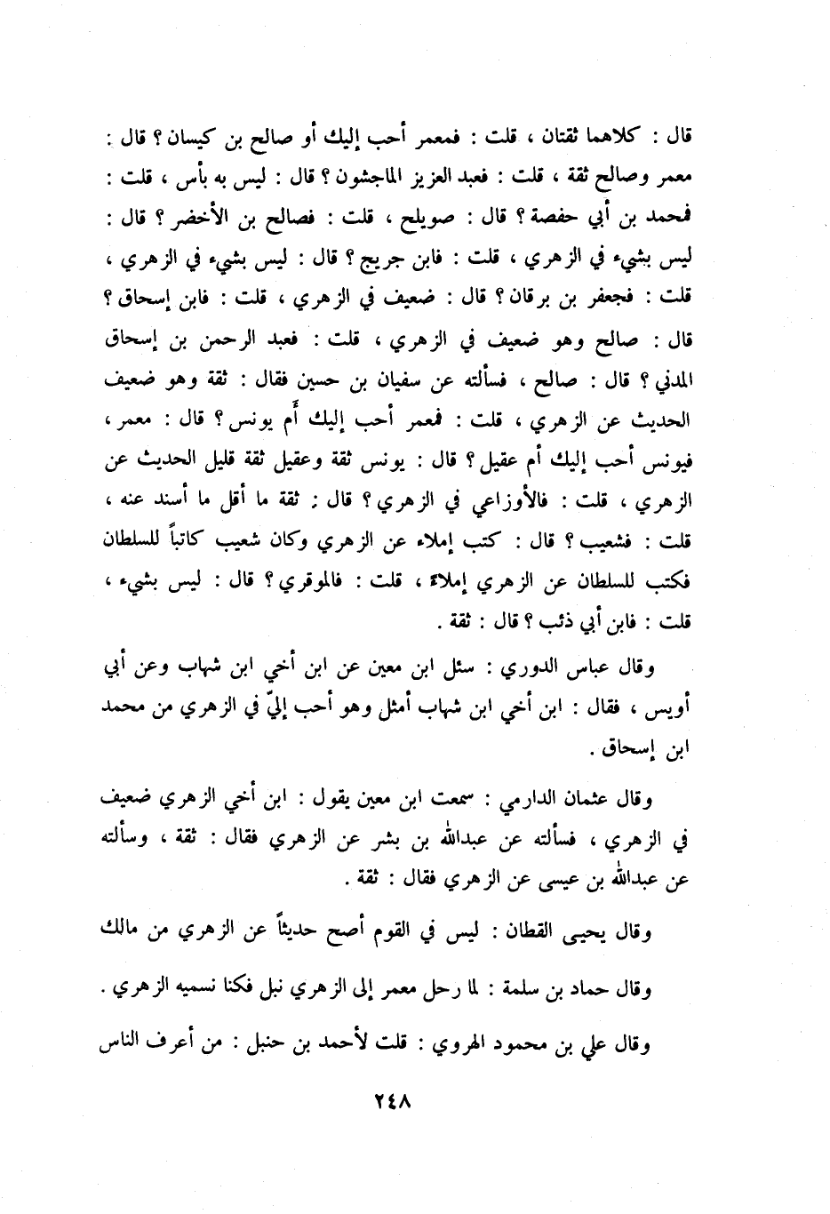قَالَ: صَالِحٌ وَهُوَ ضَعِيفٌ فِي الزُّهْرِيِّ، قُلْتُ: فَعَبْدُ الرَّحْمَنِ بْنُ إِسْحَاقَ الْمَدَنِيُّ؟ قَالَ: صَالِحٌ، فَسَأَلْتُهُ عَنْ سُفْيَانَ بْنِ حُسَيْنٍ فَقَالَ: ثِقَةٌ وَهُوَ ضَعِيفُ الْحَدِيثِ عَنِ الزُّهْرِيِّ، قُلْتُ: فَمَعْمَرٌ أَحَبُّ إِلَيْكَ أَمْ يُونُسُ؟ قَالَ: مَعْمَرٌ، فَيُونُسُ أَحَبُّ إِلَيْكَ أَمْ عُقَيْلٌ؟ قَالَ: يُونُسُ ثِقَةٌ وَعُقَيْلٌ ثِقَةٌ قَلِيلُ الْحَدِيثِ عَنِ الزُّهْرِيِّ، قُلْتُ: فَالأَوْزَاعِيُّ فِي الزُّهْرِيِّ؟ قَالَ: ثِقَةٌ مَا أَقَلُّ مَا أَسْنَدَ عَنْهُ، قُلْتُ: فَشُعَيْبٌ؟ قَالَ: كَتَبَ إِمْلاءً عَنِ الزُّهْرِيِّ وَكَانَ شُعَيْبٌ كَاتِبًا لِلسُّلْطَانِ فَكَتَبَ لِلسُّلْطَانِ عَنِ الزُّهْرِيِّ إِمْلاءً، قُلْتُ: فَالْمُوَقَّرِيُّ؟ قَالَ: لَيْسَ بِشَيْءٍ، قُلْتُ: فَابْنُ أَبِي ذِئْبٍ؟ قَالَ: ثِقَةٌ.