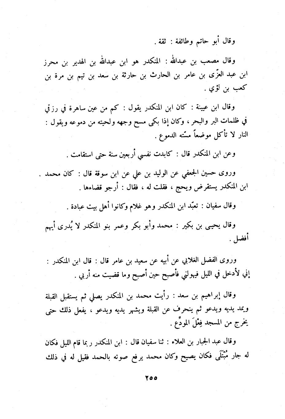 وَقَالَ إِبْرَاهِيمُ بْنُ سَعْدٍ: رَأَيْتُ مُحَمَّدَ بْنَ الْمُنْكَدِرِ يُصَلِّي ثُمَّ يَسْتَقْبِلُ الْقِبْلَةَ وَيَمُدَّ يَدَيْهِ وَيَدْعُو ثُمَّ يَنْحَرِفُ عَنِ الْقِبْلَةِ وَيُشْهِرُ يَدَيْهِ وَيَدْعُو، يَفْعَلُ ذَلِكَ حَتَّى يَخْرُجَ مِنَ الْمَسْجِدِ فِعْلَ الْمُوَدِّعِ.