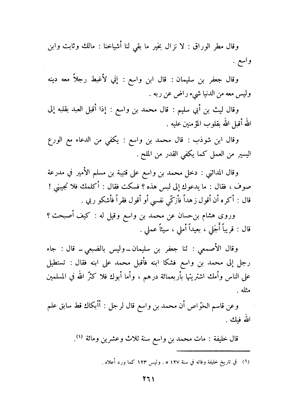 قَالَ خَلِيفَةُ: مَاتَ مُحَمَّدُ بْنُ وَاسِعٍ سَنَةَ ثلاث وعشرين ومائة [1] .