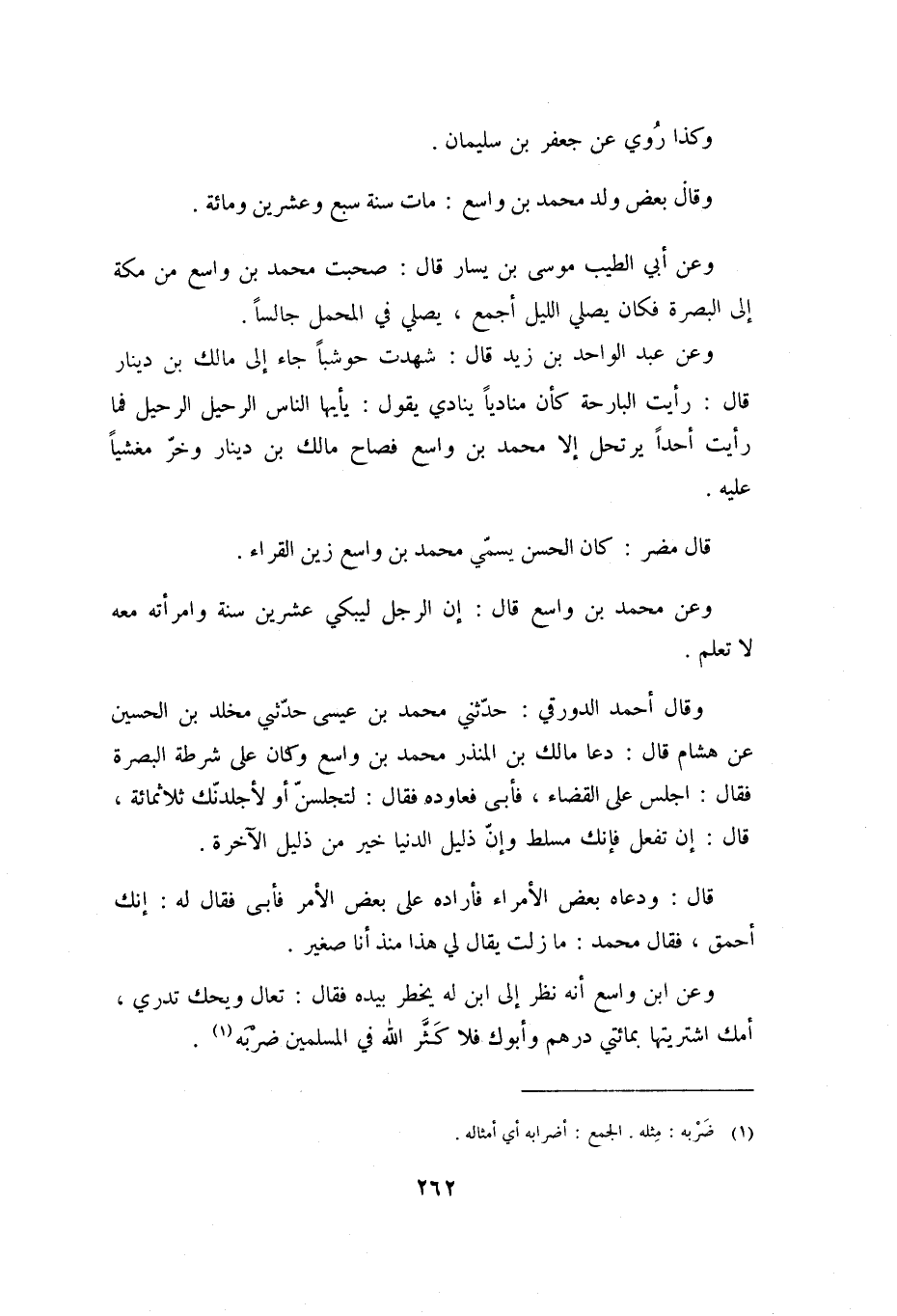 وَعَنِ ابْنِ وَاسِعٍ أَنَّهُ نَظَرَ إِلَى ابْنٍ لَهُ يَخْطُرُ بِيَدِهِ فَقَالَ: تَعَالَ وَيْحَكَ تَدْرِي، أُمُّكَ اشْتَرَيْتُهَا بِمِائَتَيْ دِرْهَمٍ وَأَبُوكَ فَلا كثّر الله في المسلمين ضربه [1] .