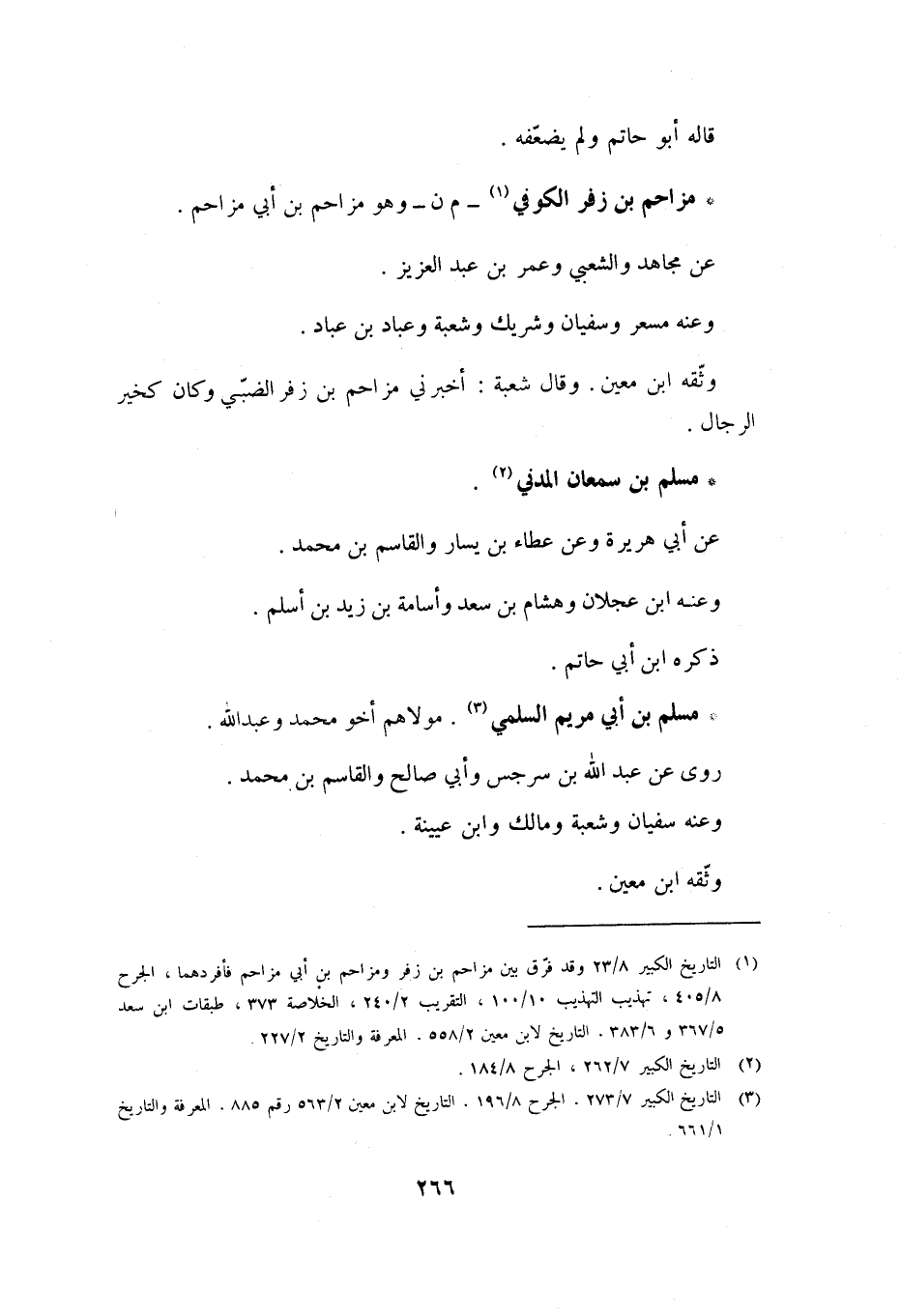 [1] التاريخ الكبير 8/ 23 وقد فرّق بين مزاحم بن زفر ومزاحم بن أبي مزاحم فأفردهما، الجرح 8/ 405، تهذيب التهذيب 10/ 100، التقريب 2/ 240، الخلاصة 373، طبقات ابن سعد 5/ 367 و 6/ 383. التاريخ لابن معين 2/ 558. المعرفة والتاريخ 2/ 227.