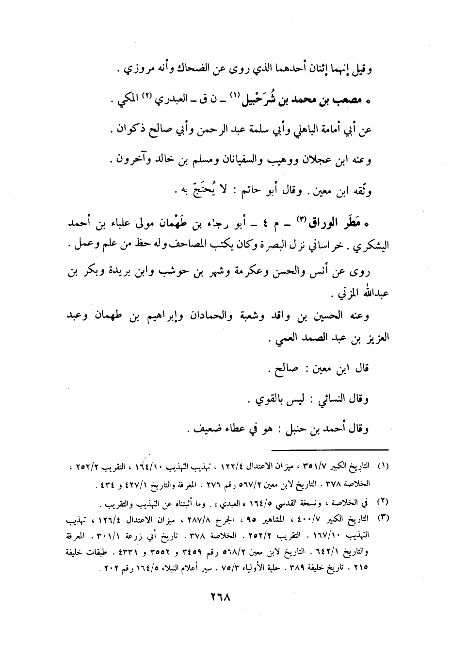 [3] التاريخ الكبير 7/ 400، المشاهير 95، الجرح 8/ 287، ميزان الاعتدال 4/ 126، تهذيب التهذيب 10/ 167. التقريب 2/ 252. الخلاصة 378. تاريخ أبي زرعة 1/ 301. المعرفة والتاريخ 1/ 642. التاريخ لابن معين 2/ 568 رقم 3459 و 3552 و 4331. طبقات خليفة 215. تاريخ خليفة 389. حلية الأولياء 3/ 75. سير أعلام النبلاء 5/ 164 رقم 202.