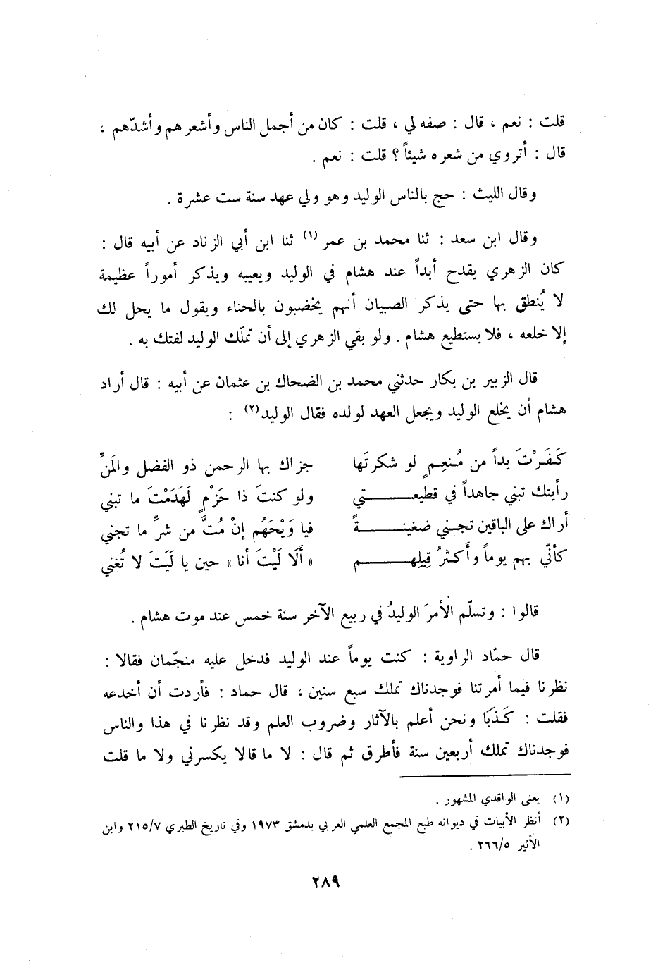 قَالَ الزُّبَيْرُ بْنُ بَكَّارٍ حَدَّثَنِي مُحَمَّدُ بْنُ الضَّحَّاكِ بْنِ عُثْمَانَ عَنْ أَبِيهِ: قَالَ أَرَادَ هِشَامٌ أن يخلع الوليد وَيَجْعَلَ الْعَهْدَ لولده فقال الوليد [2] :