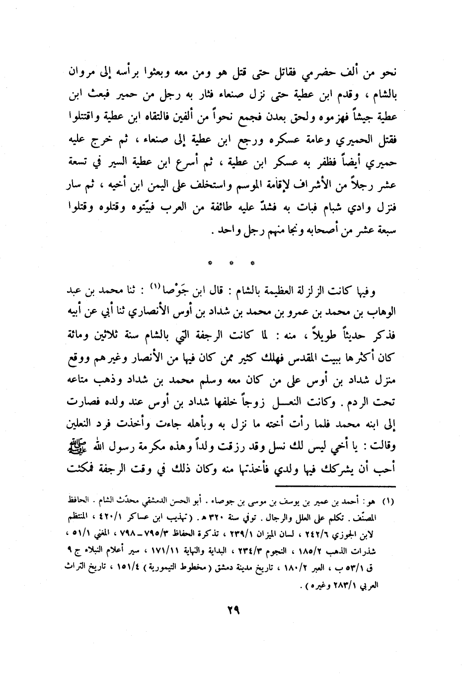 وَفِيهَا كَانَتِ الزَّلْزَلَةُ الْعَظِيمَةُ بِالشَّامِ: قَالَ ابْنُ جَوْصا [1] : ثَنَا مُحَمَّدُ بْنُ عَبْد الْوَهاب بْنِ مُحَمَّدِ بْنِ عَمْرِو بْنِ مُحَمَّدِ بْن شَدَّادِ بْنِ أَوْسٍ الأَنْصَارِيُّ ثنا أَبِي عَنْ أَبِيهِ فَذَكَرَ حَدِيثًا طَوِيلا، مِنْهُ: لَمَّا كَانَتِ الرَّجْفَةُ الَّتِي بِالشَّامِ سَنَةَ ثَلاثِينَ وَمِائَةٍ كَانَ أَكْثَرُهَا بِبَيْتِ الْمَقْدِسِ فَهَلَكَ كَثِيرٌ مِمَّنْ كَانَ فِيهَا مِنَ الأَنْصَارِ وَغَيْرِهِمْ وَوَقَعَ مَنْزِلُ شَدَّادِ بْنِ أَوْسٍ عَلَى مَنْ كَانَ مَعَهُ وَسَلِمَ مُحَمَّدُ بْنُ شَدَّادٍ وَذَهَبَ مَتَاعُهُ تَحْتَ الرَّدْمِ. وَكَانَتِ النَّعْلُ زَوْجًا خَلَّفَهَا شَدَّادُ بْنُ أَوْسٍ عِنْدَ وَلَدِهِ فَصَارَتْ إِلَى ابْنِهِ مُحَمَّدٍ فَلَمَّا رَأَتْ أُخْتُهُ مَا نَزَلَ بِهِ وَبِأَهْلِهِ جَاءَتْ وَأَخَذَتْ فَرْدَ النَّعْلَيْنِ وَقَالَتْ: يَا أَخِي لَيْسَ لَكَ نَسْلٌ وَقَدْ رُزِقْتَ وَلَدًا وَهَذِهِ مَكْرُمَةُ رَسُولِ اللَّهِ صَلَّى اللَّهُ عَلَيْهِ وَسَلَّمَ أُحِبُّ أَنْ يُشْرِكَكَ فِيهَا وَلَدِي فَأَخَذَتْهَا مِنْهُ وَكَانَ ذَلِكَ فِي وَقْتِ الرَّجْفَةِ فَمَكَثْتُ
