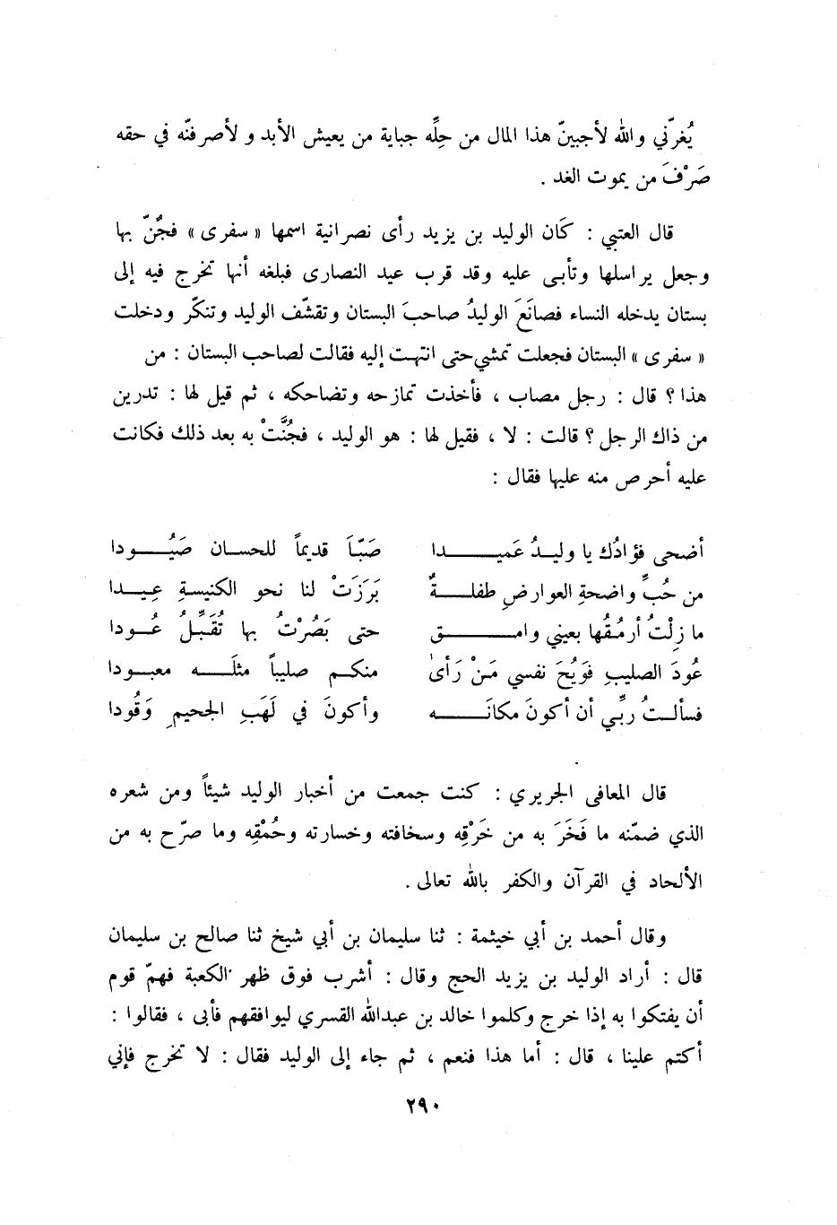 قَالَ الْعُتْبِيُّ: كَانَ الْوَلِيدُ بْنُ يَزِيدَ رَأَى نَصْرَانِيَّةً اسْمَهَا «سَفْرَى» فَجُنَّ بِهَا وَجَعَلَ يَرَاسِلُهَا وَتَأْبَى عَلَيْهِ وَقَدْ قَرُبَ عِيدُ النَّصَارَى فَبَلَغَهُ أنَهَّا تَخْرُجُ فِيهِ إلى بستان يدخله النساء فصانع الوليد صاحب البستان وتقشّف الوليد وَتَنَكَّرَ وَدَخَلَتْ «سفرى» البستان فجعلت تمشي حتى انتهت إليه فقالت لصاحب البستان: من هذا؟ قَالَ: رَجُلٌ مُصَابٌ، فَأَخَذَتْ تُمَازِحُهُ وَتُضَاحِكُهُ، ثُمَّ قِيلَ لَهَا: تَدْرِينَ مَنْ ذَاكَ الرَّجُلُ؟ قَالَتْ: لا، فَقِيلَ لَهَا: هُوَ الْوَلِيدُ، فَجُنَّتْ بِهِ بَعْد ذَلِكَ فَكَانَتْ عَلَيْهِ أَحْرَصُ مِنْهُ عَلَيْهَا فَقَالَ: