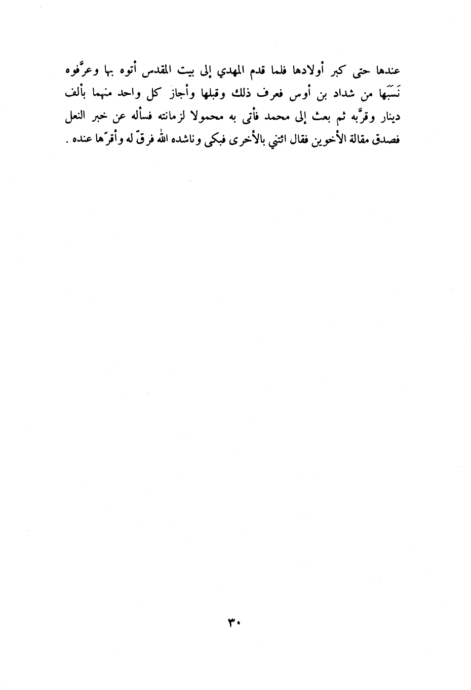 عِنْدَهَا حَتَّى كَبُرَ أَوْلادُهَا فَلَمَّا قَدِمَ الْمَهْدِيُّ إلى بيت الْمَقْدِسِ أَتَوْهُ بِهَا وَعَرَّفُوهُ نَسَبَهَا مِنْ شَدَّادِ بْنِ أَوْسٍ فَعَرَفَ ذَلِكَ وَقَبِلَهَا وَأَجَازَ كُلَّ وَاحِدٍ مِنْهُمَا بِأَلْفِ دِينَارٍ وَقَرَّبَهُ ثُمَّ بَعَثَ إِلَى مُحَمَّدٍ فَأَتَى بِهِ مَحْمُولا لِزَمَانَتِهِ فَسَأَلَهُ عَنْ خَبَرِ النَّعْلِ فَصَدَّقَ مَقَالَةَ الأَخَوَيْنِ فَقَالَ ائْتِنِي بِالأُخْرَى فَبَكَى وَنَاشَدَهُ اللَّهُ فَرَقَّ لَهُ وأقرّها عنده.