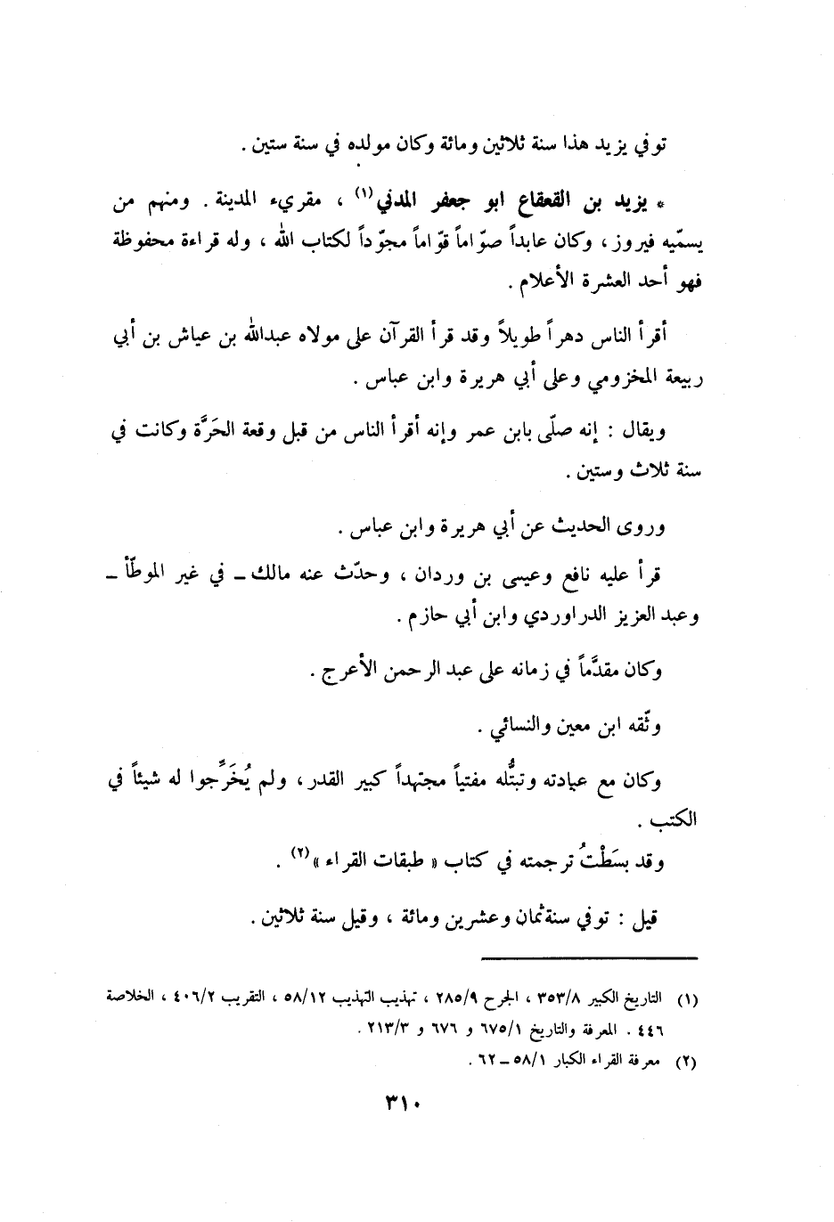 يَزِيدُ بْنُ الْقَعْقَاعِ ابو جعفر المدني [1] ، مقريء الْمَدِينَةِ. وَمِنْهُمْ مَنْ يُسَمِّيهِ فَيْرُوزَ، وَكَانَ عَابِدًا صَوَّامًا قَوَّامًا مُجَوِّدًا لِكِتَابِ اللَّهِ، وَلَهُ قِرَاءَةٌ مَحْفُوظَةٌ فَهُوَ أَحَدُ الْعَشَرَةِ الأَعْلامِ.