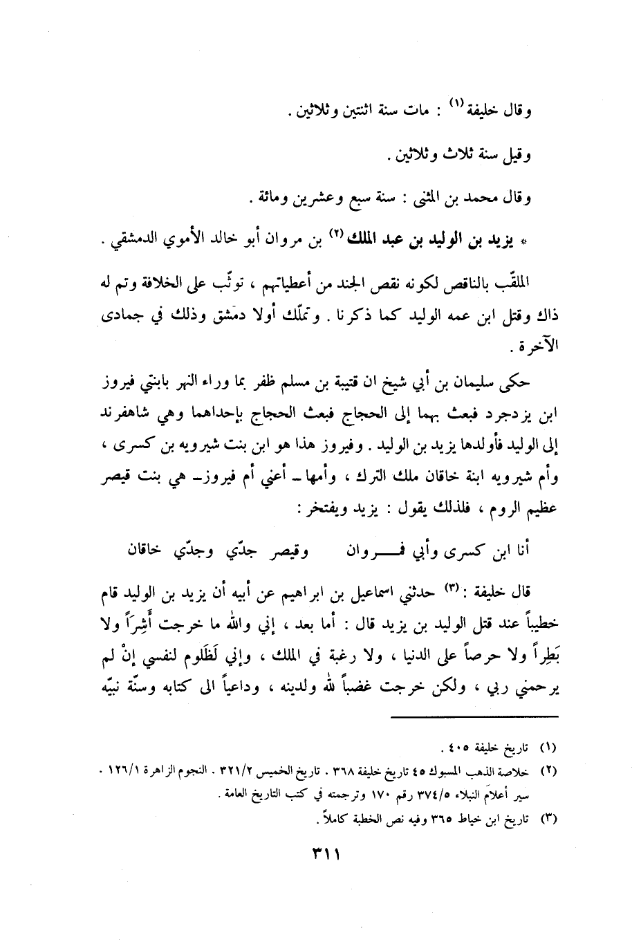 قَالَ خَلِيفَةُ: [3] حَدَّثَنِي إِسْمَاعِيلُ بْنُ إِبْرَاهِيمَ عَنْ أَبِيهِ أَنَّ يَزِيدَ بْنَ الْوَلِيدِ قَامَ خَطِيبًا عِنْدَ قَتْلِ الْوَلِيدِ بْنِ يَزِيدَ قَالَ: أَمَّا بَعْدُ، إِنِّي وَاللَّهِ مَا خَرَجْتُ أَشِرًا وَلا بَطِرًا وَلا حِرْصًا عَلَى الدَّنْيَا، وَلا رَغْبَةً فِي الْمُلْكِ، وَإِنِّي لَظَلُومٌ لِنَفْسِي إِنْ لَمْ يَرْحَمْنِي رَبِّي، وَلَكِنْ خَرَجْتُ غَضِبًا للَّه وَلِدِينِهِ، وَدَاعِيًا إِلَى كِتَابِهِ وَسُنَّةِ نبيّه