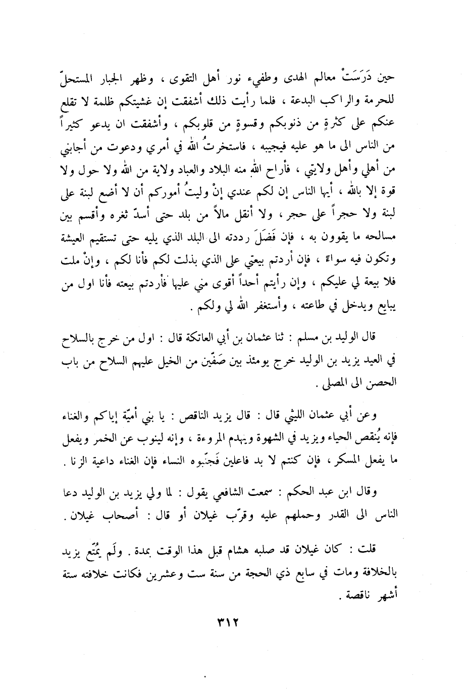 قُلْتُ: كَانَ غَيْلانُ قَدْ صَلَبَهُ هِشَامٌ قَبْلَ هَذَا الْوَقْتِ بِمُدَّةٍ. وَلَمْ يُمَتَّعْ يَزِيدُ بِالْخِلافَةِ وَمَاتَ فِي سَابِعِ ذِي الْحِجَّةِ مِنْ سَنَةِ سِتٍّ وَعِشْرِينَ فَكَانَتْ خِلافَتُهُ سِتَّةَ أَشْهُرٍ نَاقِصَةً.
