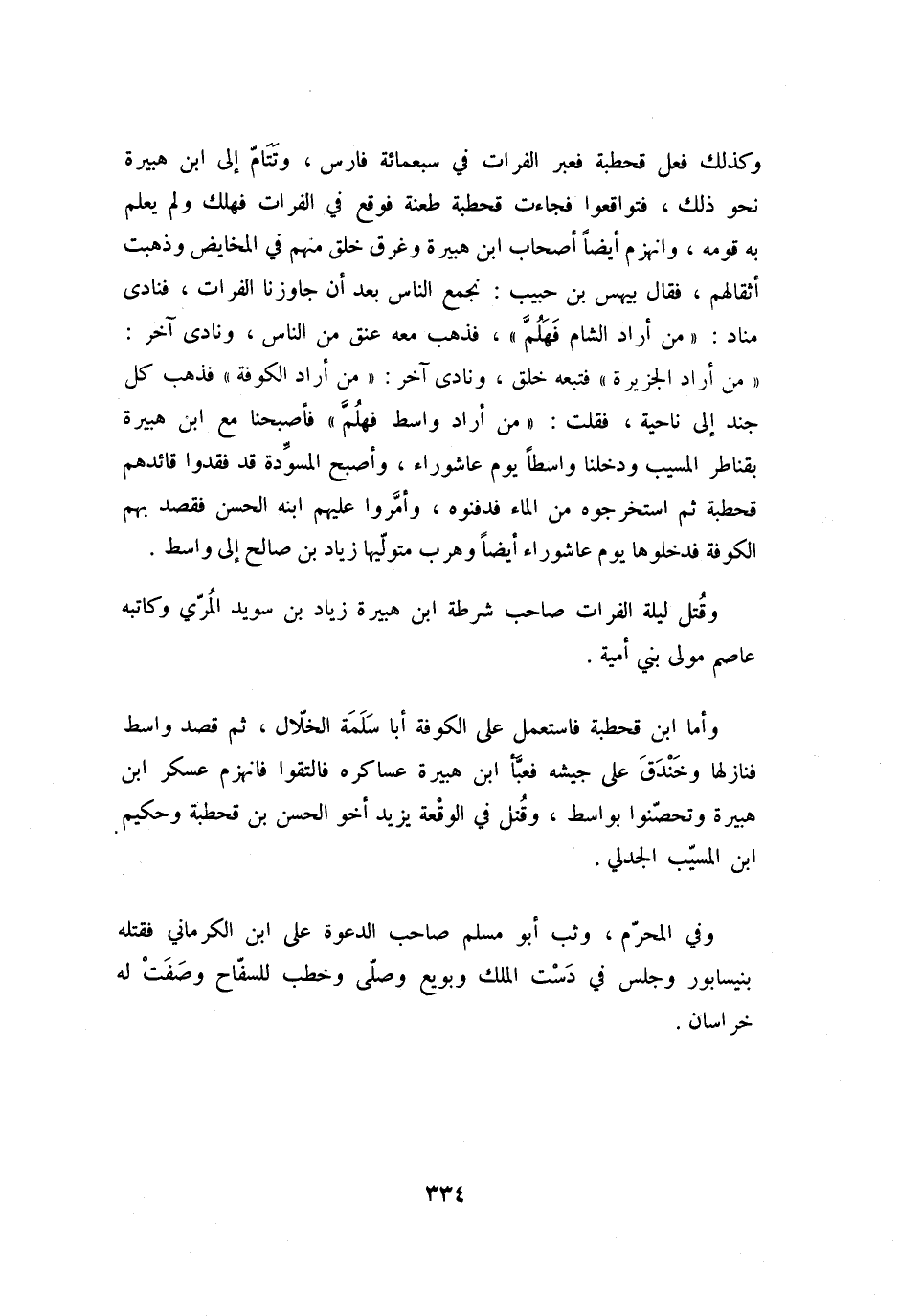 «مَنْ أَرَادَ الْجَزِيرَةَ» فَتَبِعَهُ خَلْقٌ، وَنَادَى آخَرُ: «مَنْ أَرَادَ الْكُوفَةَ» فَذَهَبَ كُلُّ جُنْدٍ إِلَى نَاحِيَةٍ، فَقُلْتُ: «مَنْ أَرَادَ وَاسِطَ فَهَلُمَّ» فَأَصْبَحْنَا مَعَ ابْنِ هُبَيْرَةَ بقناطر المسيب ودخلنا واسطا يَوْمَ عَاشُورَاءِ، وَأَصْبَحَ الْمُسَوِّدَةُ قَدْ فَقَدُوا قَائِدَهُمْ قُحْطُبَةُ ثُمَّ اسْتَخْرَجُوهُ مِنَ الْمَاءِ فَدَفَنُوهُ، وَأَمَّرُوا عَلَيْهِمُ ابْنُهُ الْحَسَنُ فَقَصَدَ بِهِمُ الْكُوفَةَ فَدَخَلُوهَا يَوْمَ عَاشُورَاءَ أَيْضًا وَهَرَبَ مُتَوَلِّيهَا زِيَادُ بْنُ صَالِحٍ إِلَى وَاسِطَ.