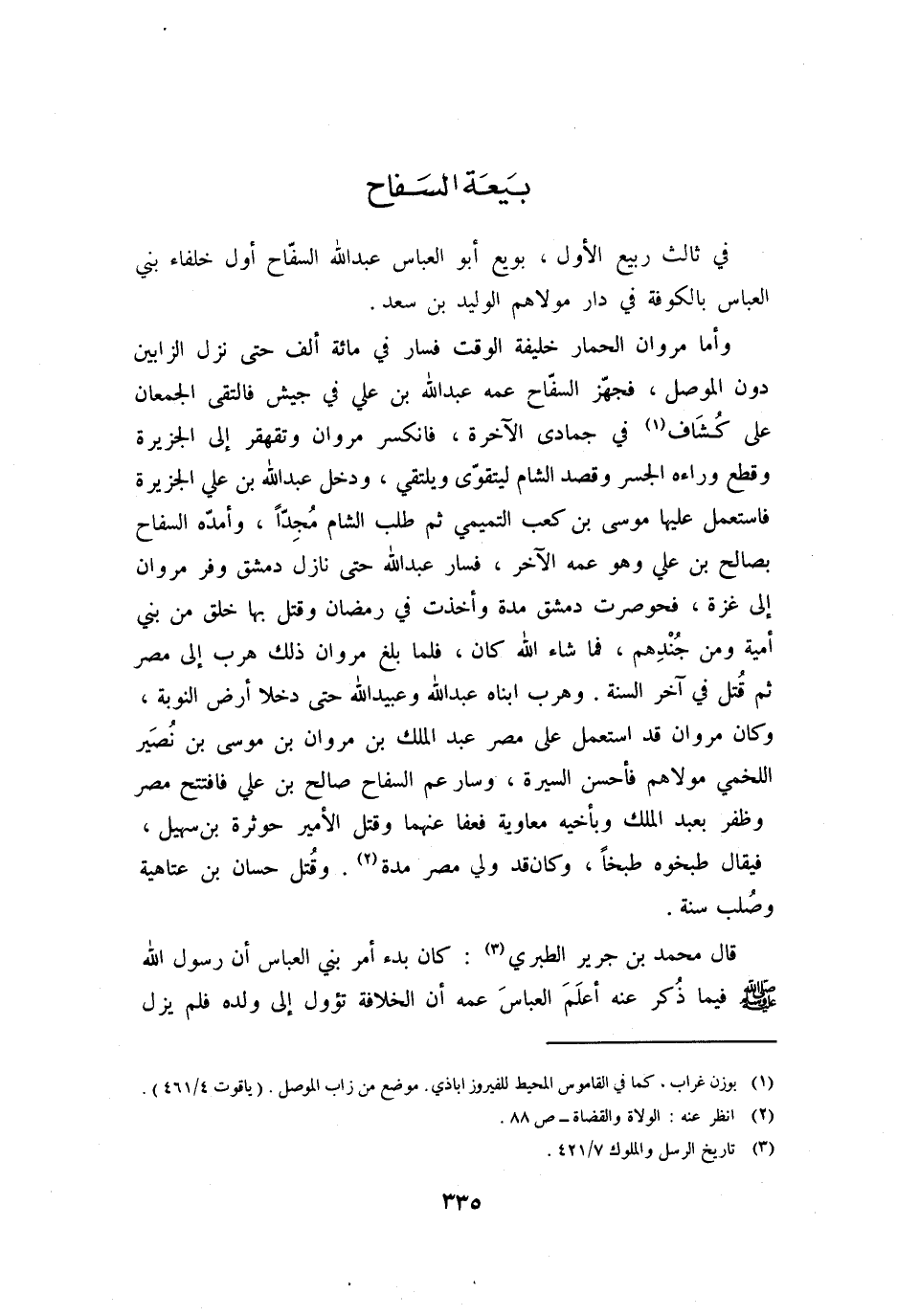 قَالَ مُحَمَّدُ بْنُ جَرِيرٍ الطَّبَرِيُّ [3] : كَانَ بَدْءُ أَمْرِ بَنِي الْعَبَّاسِ أَنّ رَسُولَ اللَّهِ صَلَّى اللَّهُ عَلَيْهِ وَسَلَّمَ فِيمَا ذُكِرَ عَنْهُ أَعْلَمَ الْعَبَّاسَ عَمَّهُ أن الخلافة تؤول إلى ولده فلم يزل
