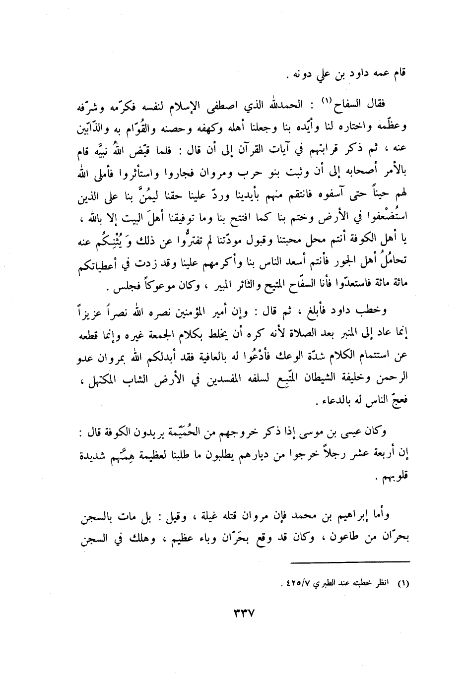 فَقَالَ السَّفَّاحُ [1] : الْحَمْدُ للَّه الَّذِي اصْطَفَى الإِسْلامَ لِنَفْسِهِ فَكَرَّمَهُ وَشَرَّفَهُ وَعَظَّمَهُ وَاخْتَارَهُ لَنَا وَأَيَّدَهُ بِنَا وَجَعَلَنَا أَهْلَهُ وَكَهْفَهُ وَحِصْنَهُ وَالْقُوَّامَ بِهِ وَالذَّابِيِّنَ عَنْهُ، ثُمَّ ذَكَرَ قَرَابَتَهُمْ فِي آيَاتِ الْقُرْآنِ إلى أن قال: فلما قيّض اللَّهُ نَبِيَّهُ قَامَ بِالأَمْرِ أَصْحَابَهُ إِلَى أَنْ وَثَبَتْ بَنُو حَرْبٍ وَمَرْوَانُ فَجَارُوا وَاسْتَأْثَرُوا فَأَمْلَى اللَّهُ لَهُمْ حِينًا حَتَّى آسَفُوهُ فَانْتَقَمَ مِنْهُمْ بِأَيْدِينَا وَرَدَّ عَلَيْنَا حَقَّنَا لِيُمِنَّ بِنَا عَلَى الَّذِينَ استُضْعِفُوا فِي الأَرْضِ وَخَتَمَ بِنَا كَمَا افْتَتَحَ بِنَا وَمَا تَوْفِيقُنَا أَهْلِ الْبَيْتِ إِلا باللَّه، يَا أَهْلَ الْكُوفَةِ أَنْتُمْ مَحَلُّ مَحَبَّتِنَا وَقَبُولُ مَوَدَّتِنَا لَمْ تَفْتَرُّوا عَنْ ذَلِكَ وَيُثْنِكُمْ عَنْهُ تَحَامُلُ أَهْلِ الْجَوْرِ فَأَنْتُمْ أَسْعَدُ النَّاسِ بِنَا وَأَكْرَمَهُمْ عَلَيْنَا وَقَدْ زِدْتُ فِي أَعْطِيَاتِكُمْ مِائَةَ مِائَةٍ فَاسْتَعِدُّوا فَأَنَا السَّفَّاحُ الْمُتِيحُ وَالثَّائِرُ الْمُبِيرُ، وَكَانَ مَوْعُوكًا فَجَلَسَ.