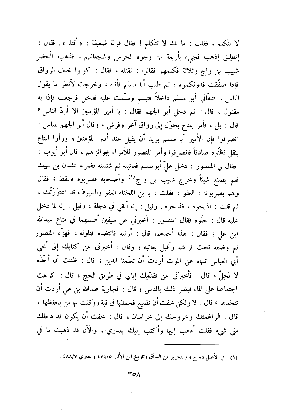 فَقَالَ لِيَ الْمَنْصُورُ: دَخَلَ عَلَيَّ أَبُو مُسْلِمٍ فَعَاتَبْتُهُ ثُمَّ شَتَمْتُهُ فَضَرَبَهُ عُثْمَانُ بْنُ نَهِيكٍ فَلَمْ يَصْنَعْ شَيْئًا وَخَرَجَ شَبِيبُ بْنُ وَاجٍ [1] وَأَصْحَابَهُ فَضَرَبُوهُ فَسَقَطَ، فَقَالَ وَهُمْ يَضْرِبُونَهُ: الْعَفْوَ، فَقُلْتُ: يَا بْنَ اللَّخْنَاءِ الْعَفْوَ وَالسُّيُوفُ قَدِ اعْتَوَرَتْكَ، ثُمَّ قُلْتَ: اذْبَحُوهُ، فَذَبَحُوهُ. وَقِيلَ: إِنَّهُ أُلْقِيَ فِي دِجْلَةَ، وَقِيلَ: إِنَّهُ لَمَّا دَخَلَ عَلَيْهِ قَالَ: خَلُّوهُ فَقَالَ الْمَنْصُورُ: أَخْبِرْنِي عَنْ سَيْفَيْنِ أَصَبْتَهُمَا فِي مَتَاعِ عَبْدِ اللَّهِ ابن عَلِيٍّ، فَقَالَ: هَذَا أَحَدُهُمَا قَالَ: أَرِنِيهِ فَانْتَضَاهُ فَنَاوَلَهُ، فَهَزَّهُ الْمَنْصُورُ ثُمَّ وَضَعَهُ تَحْتَ فِرَاشِهِ وَأَقْبَلَ يُعَاتِبُهُ، وَقَالَ: أَخْبِرْنِي عَنْ كِتَابِكَ إِلَى أَخِي أَبِي الْعَبَّاسِ تَنْهَاهُ عَنِ الْمَوْتِ أَرَدْتَ أَنْ تُعَلِّمَنَا الدِّينَ، قَالَ: ظَنَنْتُ أَنَّ أَخْذَهُ لا يَحِلُّ، قَالَ: فَأَخْبِرْنِي عَنْ تَقَدُّمِكَ إِيَّايَ فِي طَرِيقِ الْحَجِّ، قَالَ: كَرِهْتُ اجْتِمَاعَنَا عَلَى الْمَاءِ فَيَضُرُّ ذَلِكَ بِالنَّاسِ، قَالَ: فَجَارِيةُ عَبْدِ اللَّهِ بْنِ عَلِيٍّ أَرَدْتَ أَنْ تَتَّخِذَهَا، قَالَ: لا وَلَكِنْ خِفْتُ أَنْ تَضِيعَ فَحَمَلْتُهَا فِي قُبَّةٍ وَوَكَّلْتُ بِهَا مَنْ يَحْفَظُهَا، قَالَ: فَمُرَاغَمَتِكَ وَخُرُوجِكَ إِلَى خُرَاسَانَ، قَالَ: خِفْتُ أَنْ يَكُونَ قَدْ دَخَلَكَ مِنِّي شَيْءٌ فَقُلْت أَذْهَبُ إِلَيْهَا وَأَكْتُبُ إِلَيْكَ بِعُذْرِي، وَالآنَ قَدْ ذَهَبْتَ مَا في