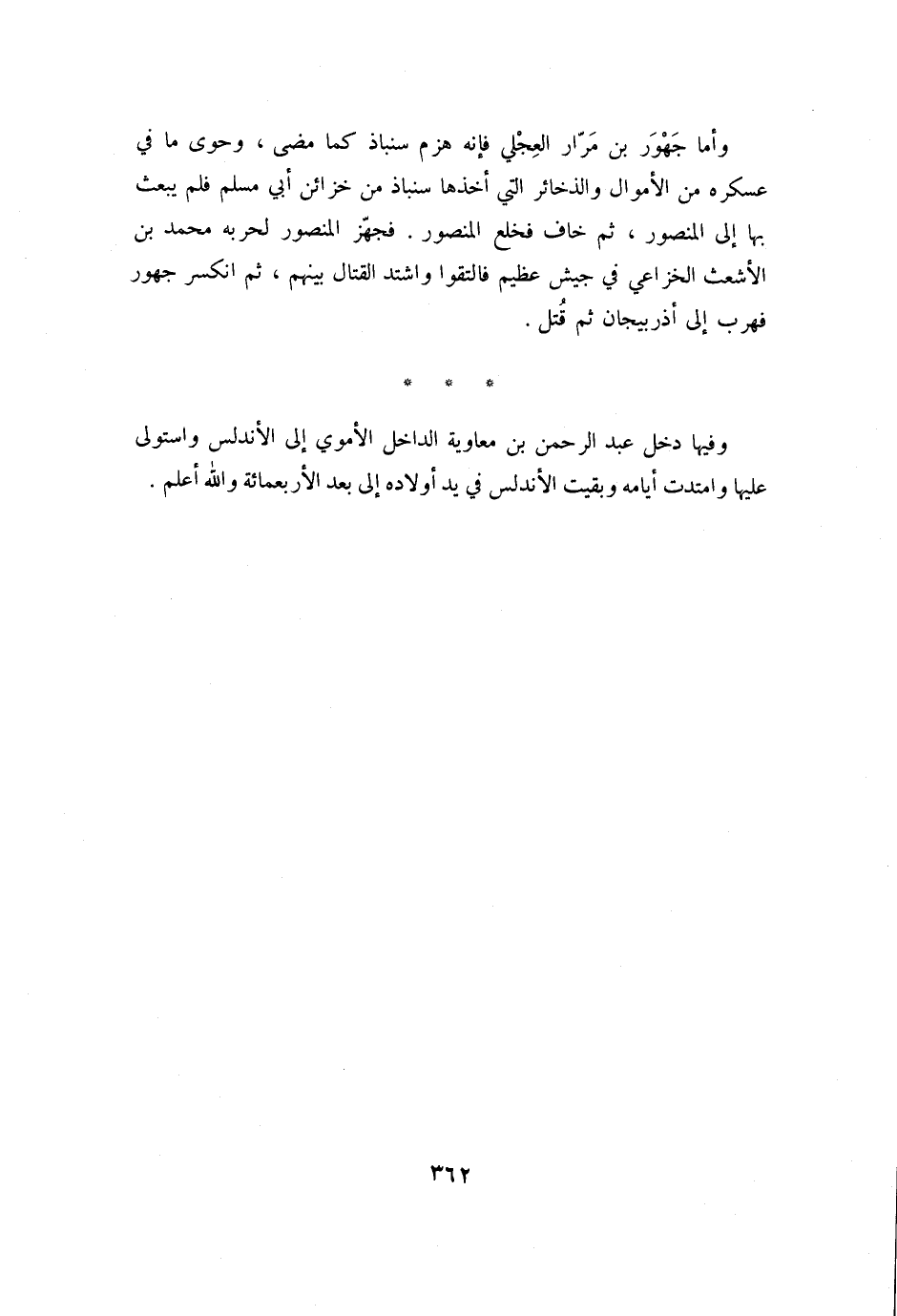 وَفِيهَا دَخَلَ عَبْدُ الرَّحْمَنِ بْنُ مُعَاوِيَةَ الدَّاخِلُ الأُمَوِيُّ إِلَى الأَنْدَلُسِ وَاسْتَوْلَى عَلَيْهَا وَامْتَدَّتْ أَيَّامُهُ وَبَقِيَتِ الأَنْدَلُسُ فِي يَدِ أوْلادِهِ إِلَى بَعْدِ الأَرْبَعِمِائَةِ والله أعلم.