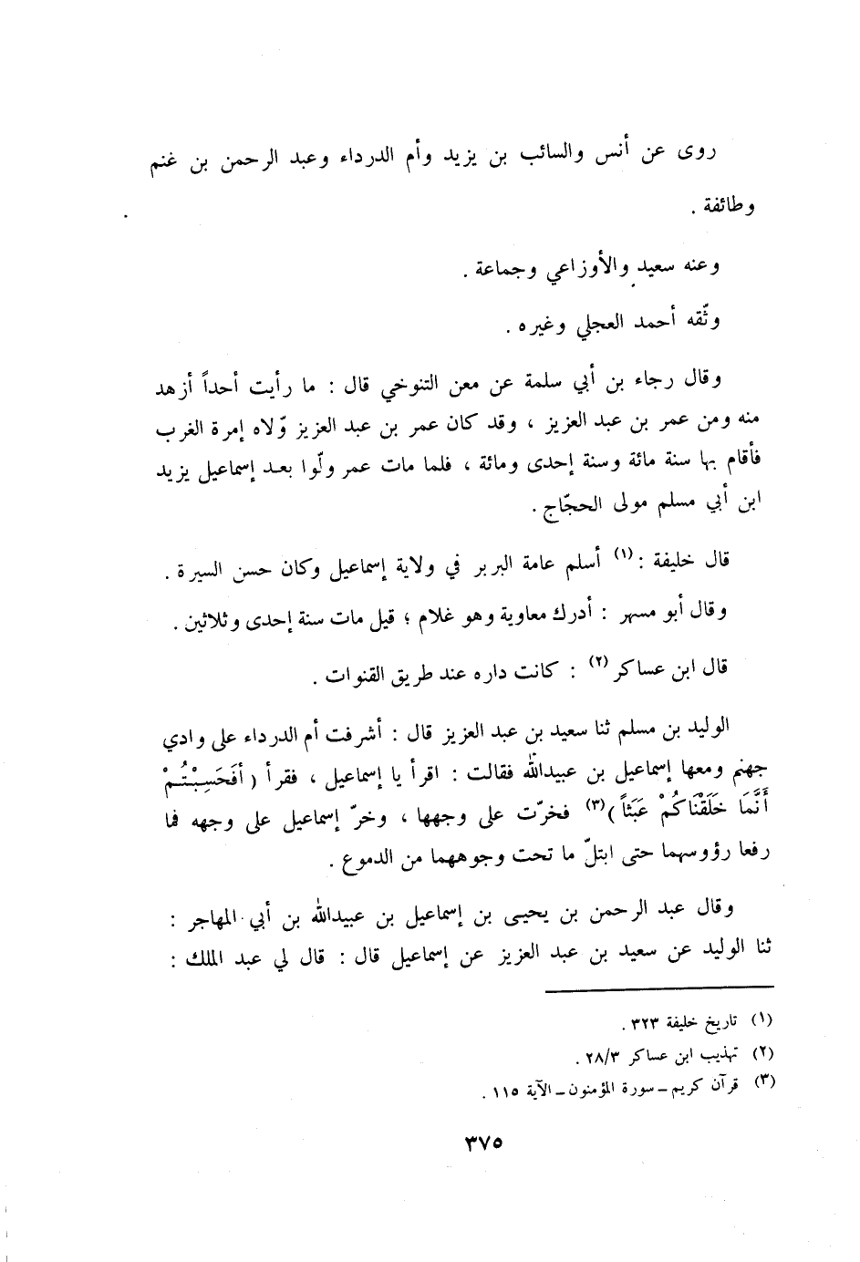 الْوَلِيدُ بْنُ مُسْلِمٍ ثنا سَعِيدُ بْنُ عَبْدِ الْعَزِيزِ قَالَ: أَشْرَفَتْ أُمُّ الدَّرْدَاءِ عَلَى وَادِي جَهَنَّمَ وَمَعَهَا إِسْمَاعِيلُ بْنُ عُبَيْدِ اللَّهِ فَقَالَتْ: اقْرَأْ يَا إِسْمَاعِيلُ، فَقَرَأَ (أَفَحَسِبْتُمْ أَنَّما خَلَقْناكُمْ عَبَثاً) 23: 115 [3] فَخَرَّتْ عَلَى وَجْهِهَا، وَخَرَّ إِسْمَاعِيلُ عَلَى وَجْهِهِ فَمَا رَفَعَا رُءُوسَهُمَا حَتَّى ابْتَلَّ مَا تَحْتَ وُجُوهِهِمَا مِنَ الدُّمُوعِ.