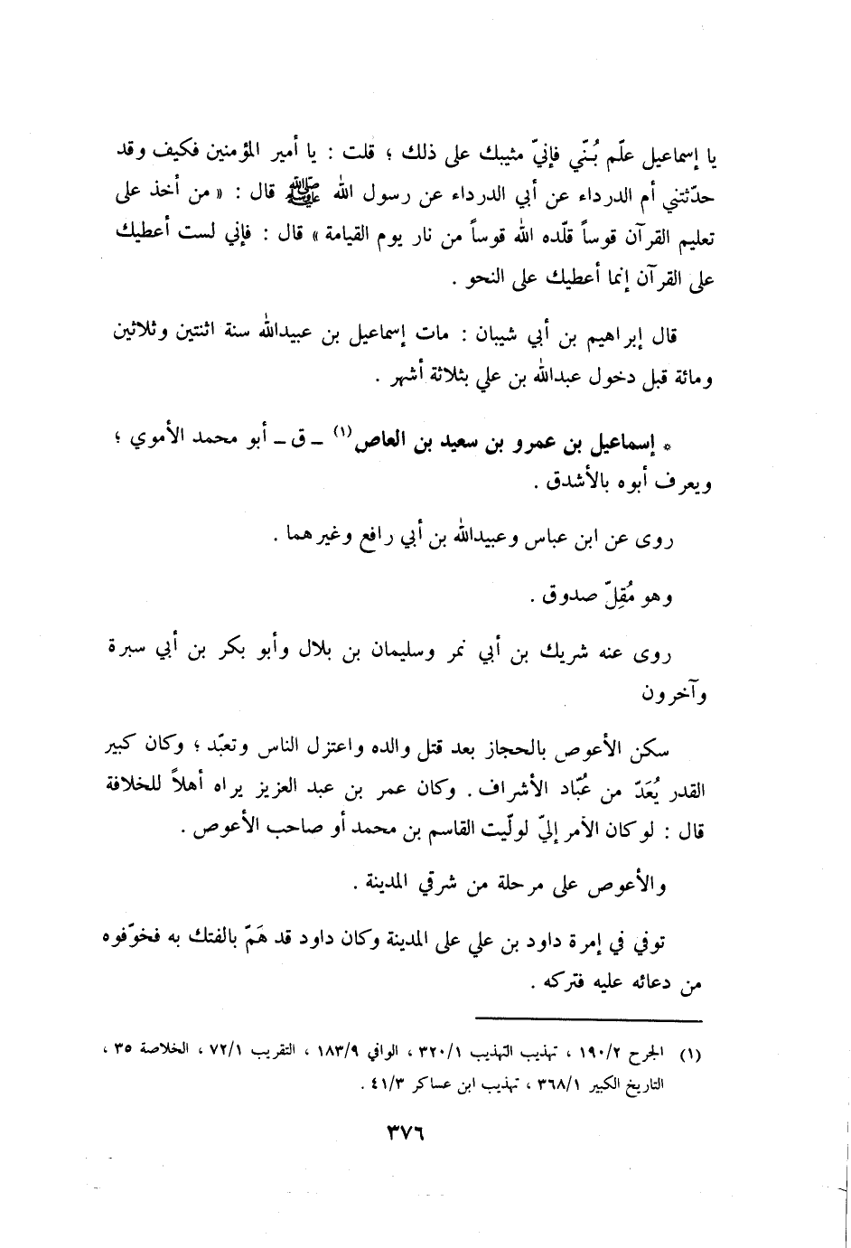 يَا إِسْمَاعِيلُ عَلِّمْ بَنِيَّ فَإِنِّي مُثِيبُكَ عَلَى ذَلِكَ، قُلْتُ: يَا أَمِيرَ الْمُؤْمِنِينَ فَكَيْفَ وَقَدْ حَدَّثَتْنِي أُمُّ الدَّرْدَاءِ عَنْ أَبِي الدَّرْدَاءِ عَنْ رَسُولِ اللَّهِ صَلَّى اللهُ عَلَيْهِ وَسَلَّمَ قال: «مَنْ أَخَذَ عَلَى تَعْلِيمِ الْقُرْآنِ قَوْسًا قَلَّدَهُ اللَّهُ قَوْسًا مِنْ نَارٍ يَوْمَ الْقِيَامَةِ» قَالَ: فَإِنِّي لَسْتُ أُعْطِيكَ عَلَى الْقُرْآنِ إِنَّمَا أَعْطِيكَ عَلَى النَّحْوِ.